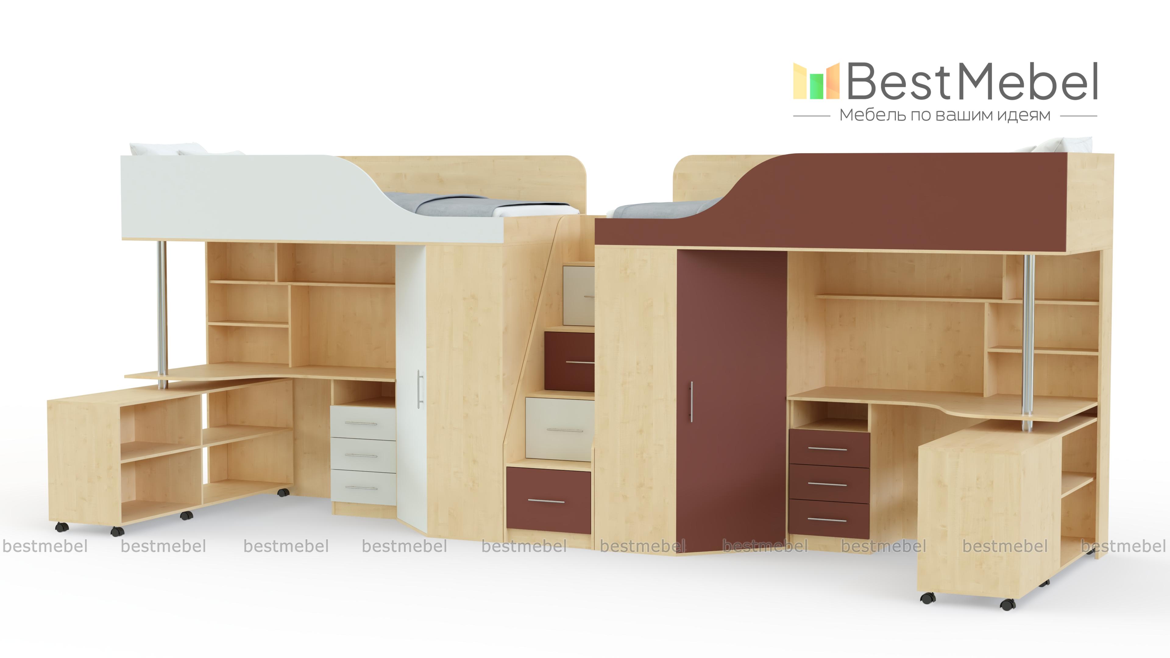 Кровать-чердак с рабочей зоной Мираж 17 BMS поможет вам рационально организовать пространство и обустроить комфортную современную детскую. Линейная композиция включает в себя два комфортных спальных места, расположенных на втором ярусе, лестницу-комод, распашные шкафы для одежды и рабочие места со столиками, книжными полками и тумбами для мелочей. Контрастные матовые фасады гармонично дополнят интерьер комнаты подростков. Купить кровать-чердак с рабочей зоной Мираж 17 BMS приглашаем в наш интернет-магазин.