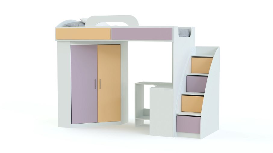 Кровать-чердак со шкафом и столом Фимо 2 BMS поможет вам создать визуально легкий и функциональный интерьер. Двухъярусная композиция включает в себя все необходимое ребенку для комфортного сна, учебы и хранения вещей – спальное место с бортиком и практичной лестницей-комодом, платяной шкаф-трапецию и угловой компьютерный столик с полкой и подставкой под монитор. Матовые фасады просты в уходе и надолго сохранят эстетичный вид. Купить кровать-чердак со шкафом и столом Фимо 2 BMS и сэкономить пространство вам поможет наш интернет-магазин.