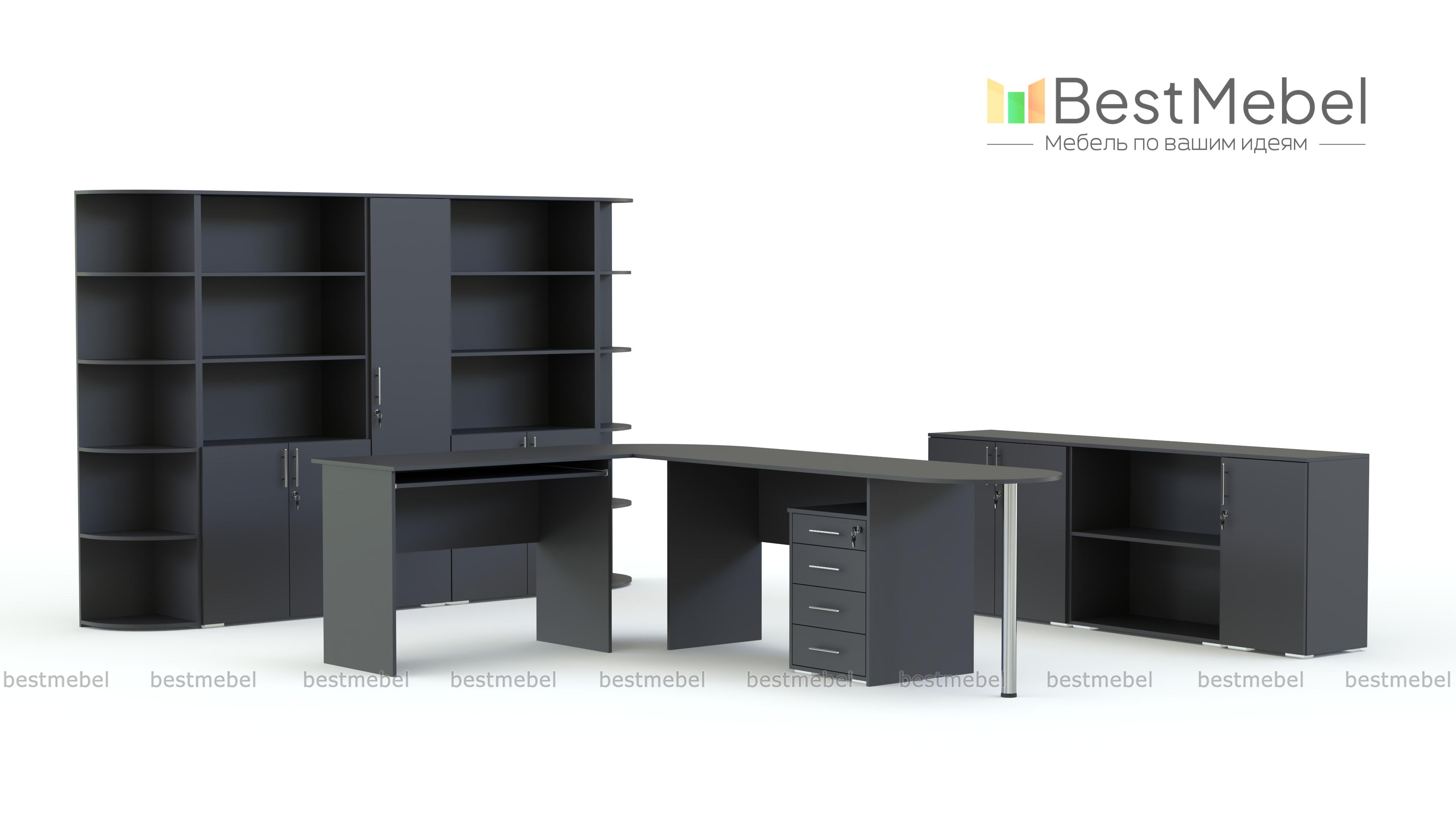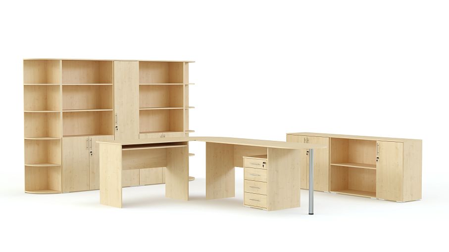 Офисный комплект Кабинет Mag Euro BMS поможет полностью оборудовать комфортный и стильный кабинет для руководителя. Входящие в комплект модули отличает гармоничное сочетание натуральных древесных оттенков, хромированных элементов и простых, строгих линий. Кабинет включает в себя письменный стол с двумя приставными столиками, тумбу, закрытый однодверный шкаф, комбинированные шкафы с открытыми полками и угловой элемент. Купить офисный комплект Кабинет Mag Euro BMS вы всегда сможете по лучшей цене в нашем интернет-магазине.