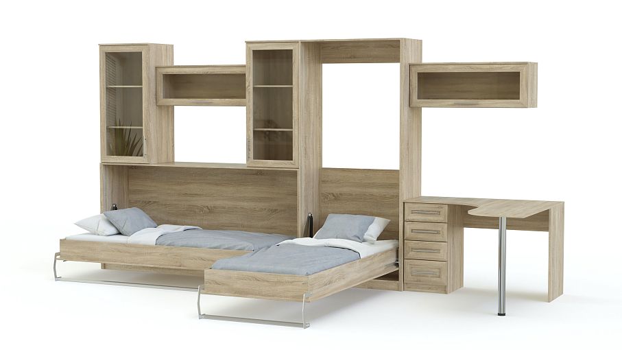 Шкаф-кровать трансформер Виктор BMS поможет максимально эффективно использовать доступное пространство. Угловая композиция, объединившая удобную систему хранения, рабочую зону и два спальных места, станет находкой для малогабаритных детских комнат. В комплект, выполненный в классических древесных тонах, входят открытые и застекленные полки на хромированных опорах, компьютерный столик и две откидных кровати – с вертикальным и горизонтальным механизмом подъема. Купить шкаф-кровать трансформер Виктор BMS приглашаем в наш интернет-магазин по доступной цене.