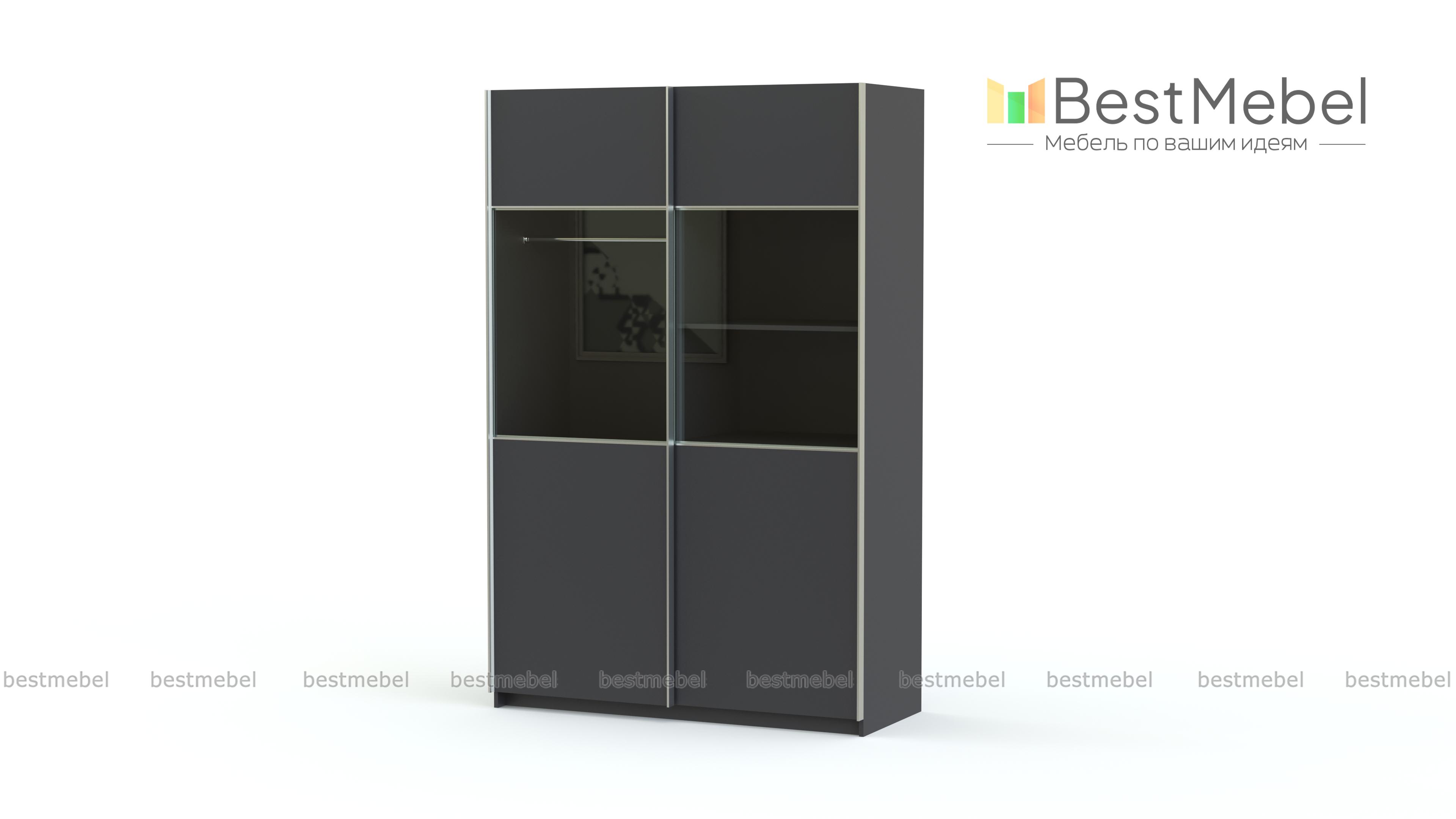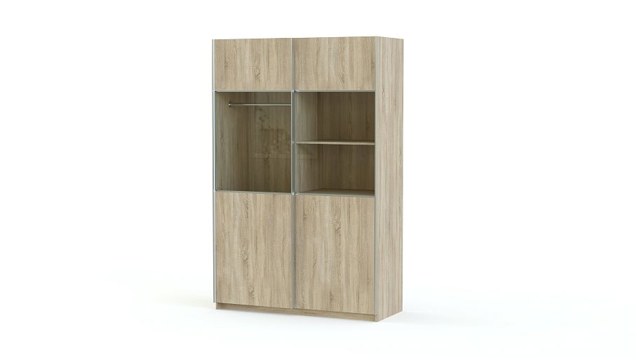Двухдверный шкаф-купе Риан 9 BMS привлекателен, в первую очередь, необычным дизайном. Раздвижные двери модели, выполненные в теплых оттенках массива дерева, в средней части имеют широкую стеклянную вставку, что оригинально смотрится и легко позволит найти нужную вещь. Шкаф оборудован стандартными бельевым и одежным отделением со штангой. Фасады выполнены из прочных, устойчивых к повреждениям материалов и оснащены удобными профиль-ручками цвета хрома.