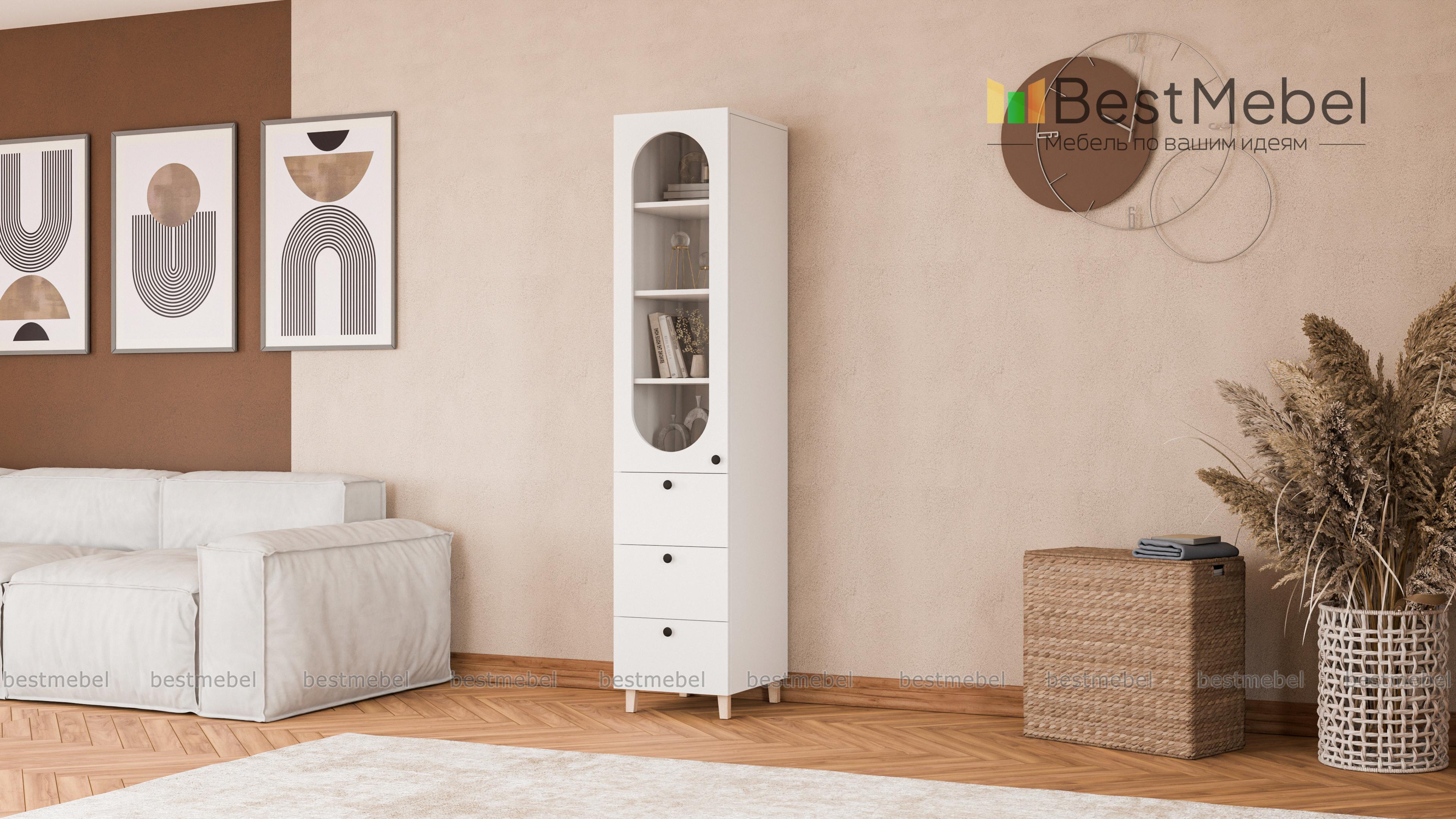 Шкаф-пенал Рене 1 BMS дополнит гостиный интерьер, рабочую зону или столовую. Элегантная витрина с овальным вырезом и три выдвижных ящика разместят книги, посуду и декор, а также множество мелочей. На износостойком темном фасаде из МДФ — удобные в эксплуатации круглые ручки, высокие деревянные опоры шкафа выполнены в цвет корпуса. Купить шкаф шкаф-пенал Рене 1 BMS с учетом необходимых размеров вы сможете по доступной цене на сайте нашего интернет-магазина.