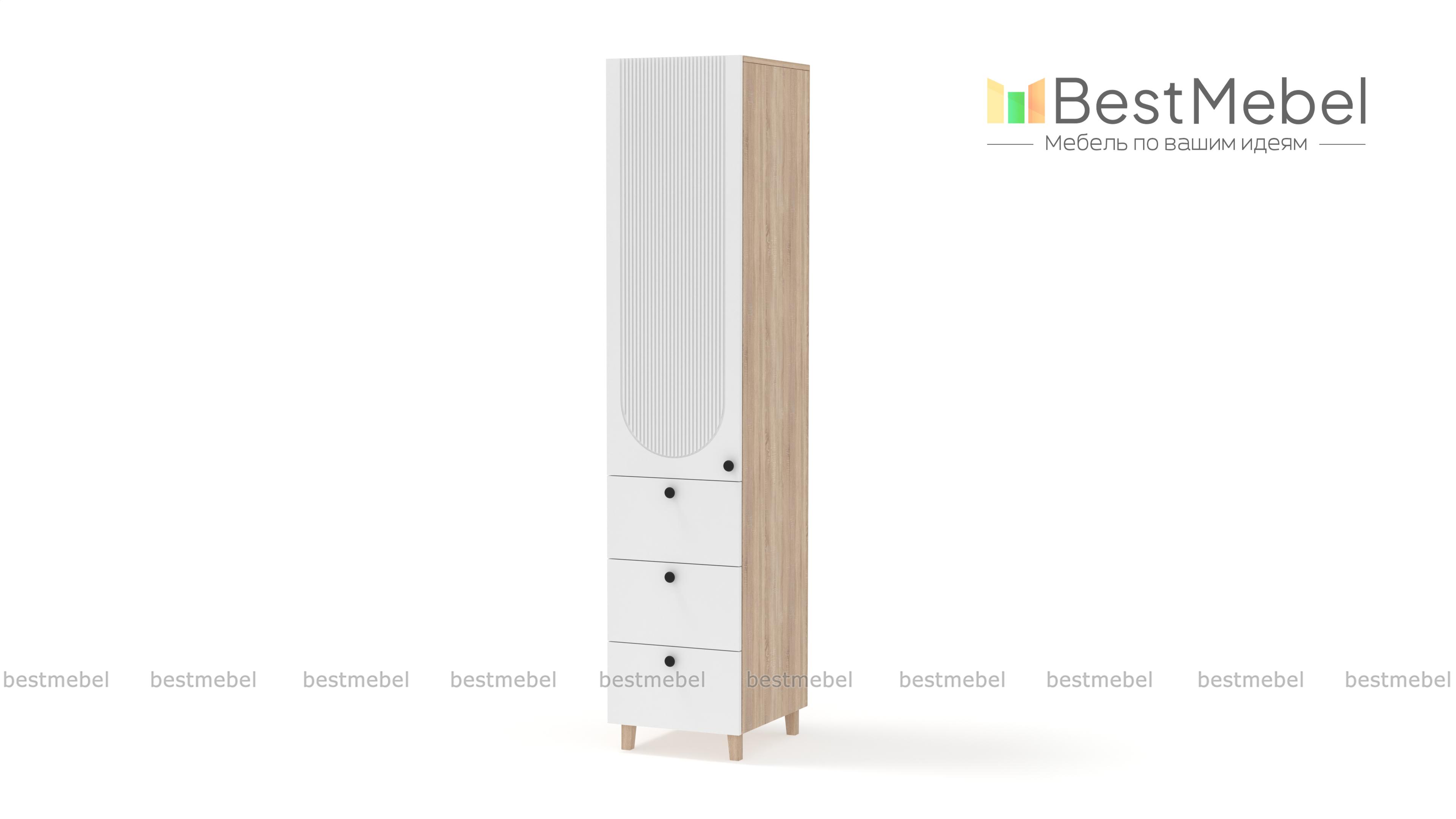 Шкаф-пенал Рене 10 BMS сделает простым и удобным хранение одежды, домашнего текстиля, материалов для работы и творчества. Комбинированная модель оборудована распашной секцией сверху и тремя выдвижными ящиками, расположенными в основании. Лаконичный светлый дизайн оживляют стильные детали: высокие ножки, фрезерованный декор и контрастные круглые ручки. Купить шкаф-пенал Рене 10 BMS с индивидуальным подбором цвета и габаритов приглашаем в наш интернет-магазин.