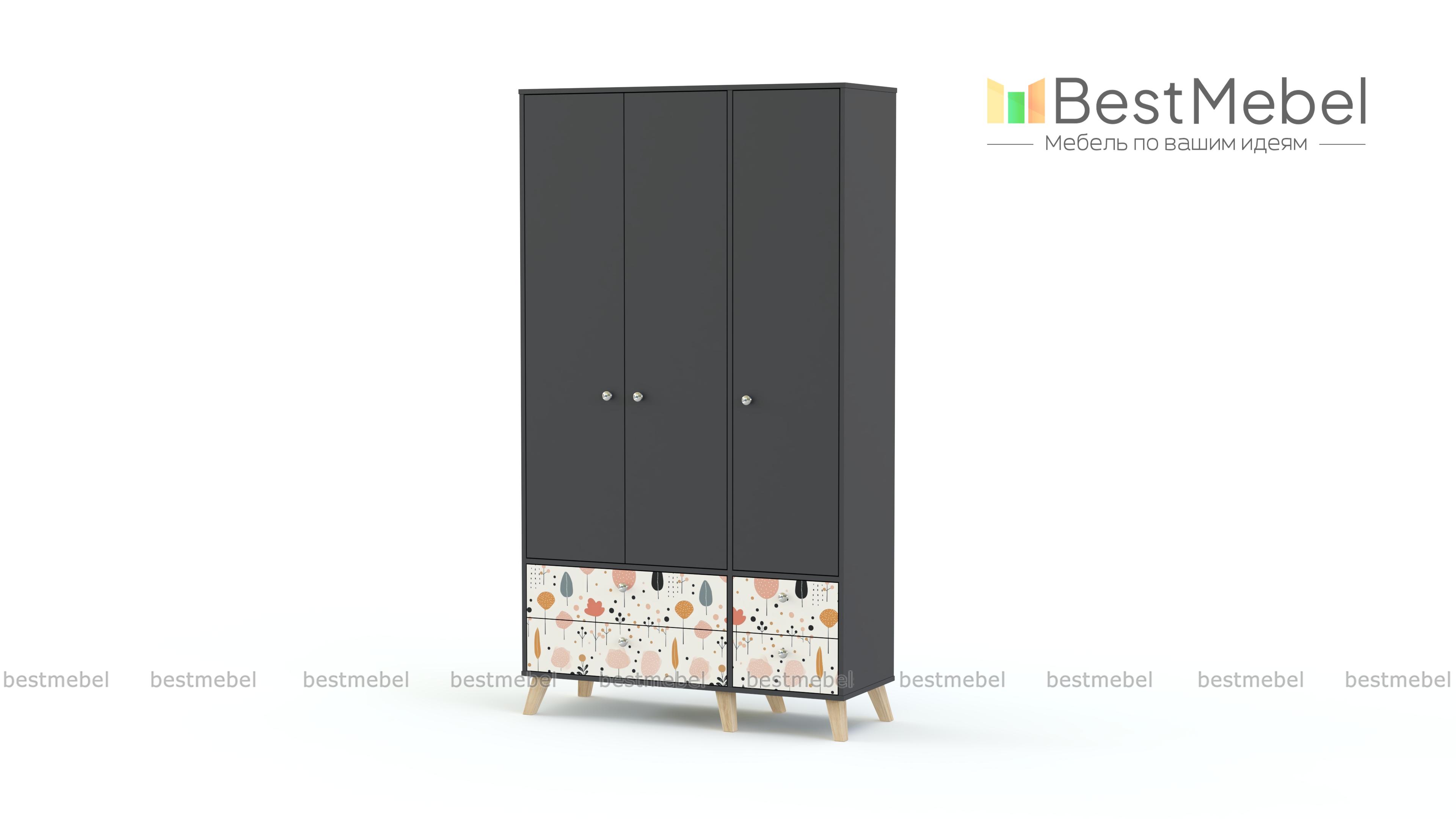 Шкаф распашной Эльза 5 BMS с деревянными ножками вы сможете использовать самостоятельно или в комплекте с другими предметами коллекции. Трехдверный шкаф в детскую оборудован полками и штангой, а в нижней части располагаются два больших и два малых выдвижных ящика. Модель в универсальном светлом оформлении украшена по фасаду нежным рисунком-фотопечатью. Купить шкаф распашной Эльза 5 BMS, изготовленный по вашим размерам, приглашаем к нам в интернет-магазин.