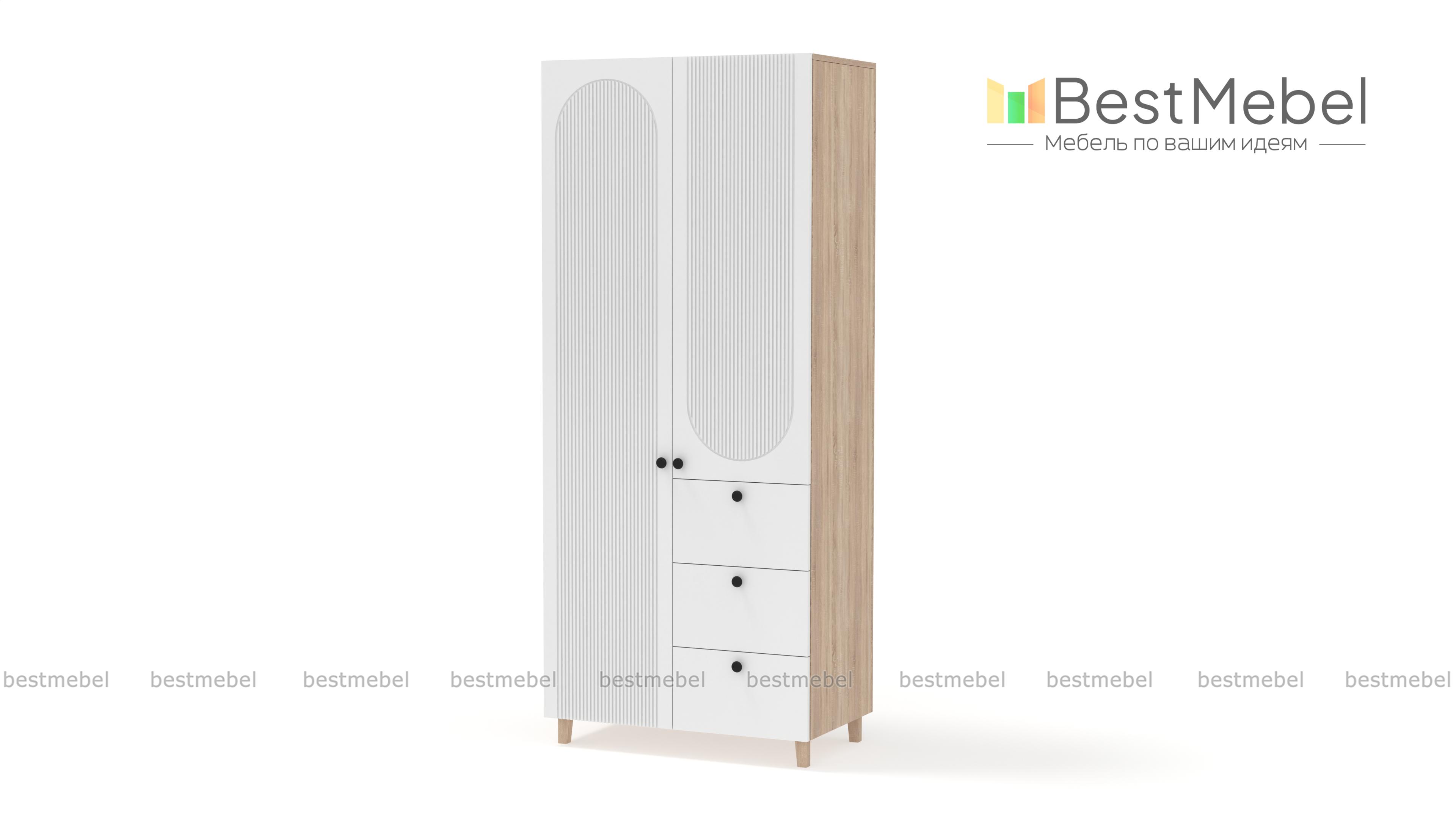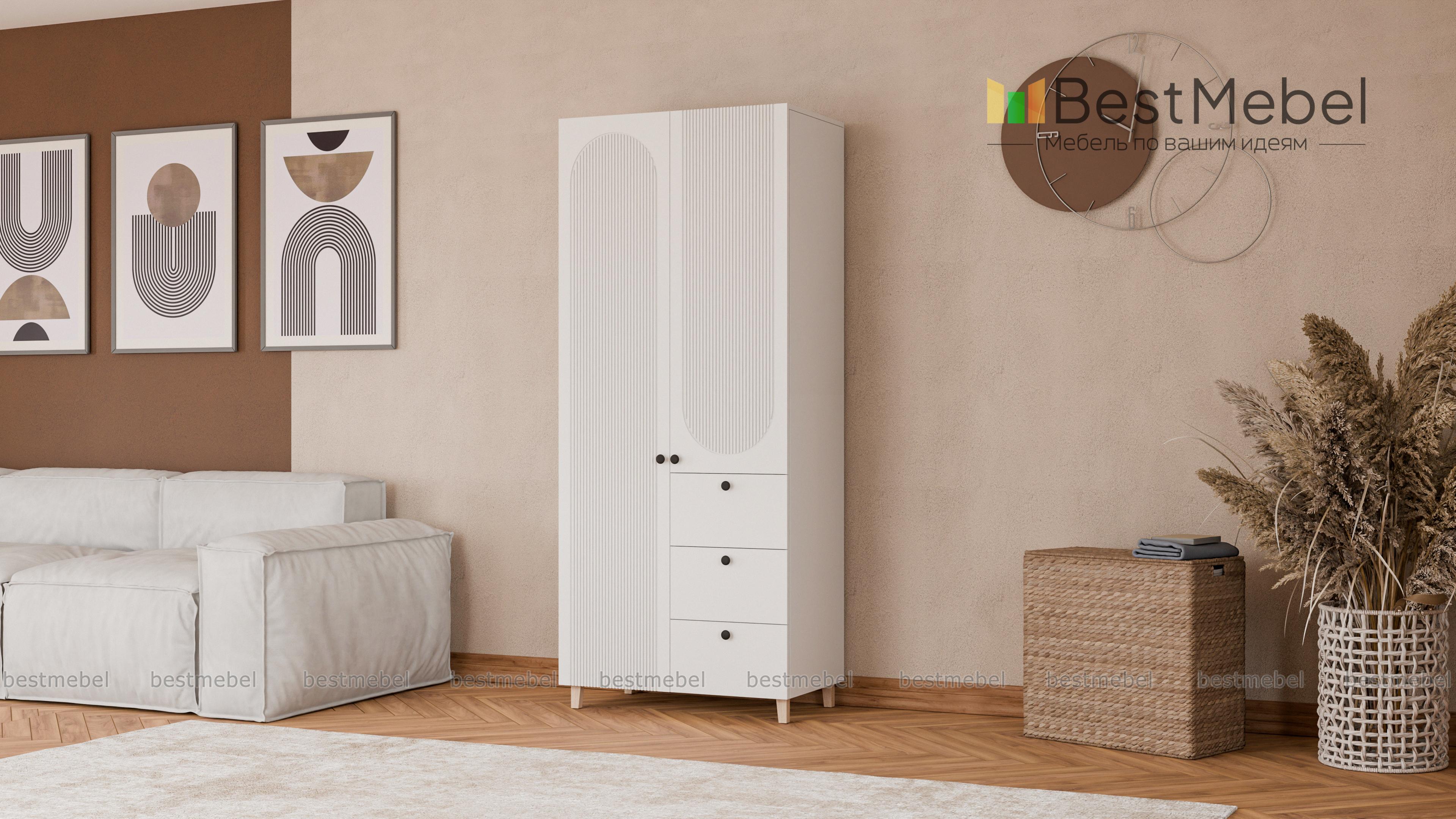 Шкаф распашной Рене 18 BMS — это небольшой гардероб, стильный и функциональный. Для хранения одежды предназначены распашные секции, а дополнение в виде трех выдвижных ящиков позволит разместить в порядке постельное белье и мелкий трикотаж. В отделке фасада шкафа использована оригинальная геометричная фрезеровка, высокие ножки добавят силуэту легкости. Купить шкаф распашной Рене 18 BMS вы всегда сможете в нашем интернет-магазине, самостоятельно подобрав цвета и размеры.