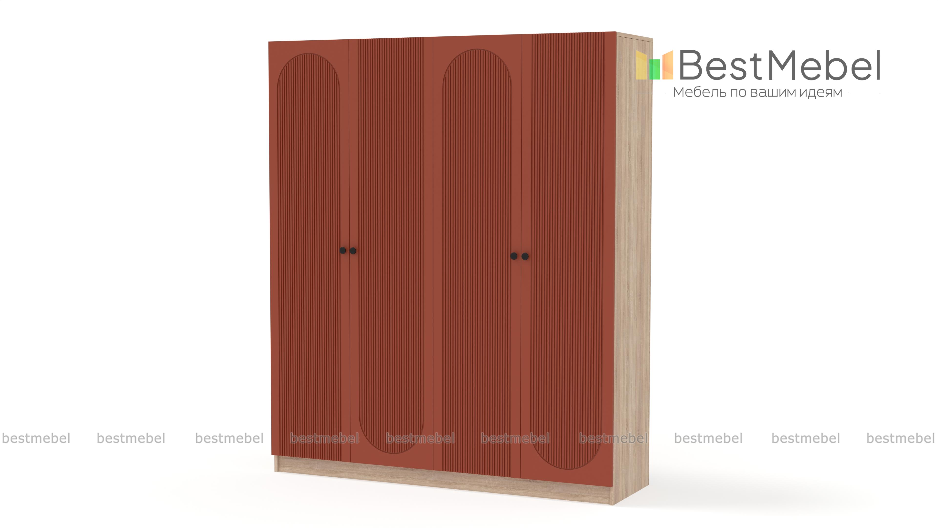 Шкаф распашной Рене 26 BMS сочетает в себе современную эстетику, функциональность и надежность конструкции. Два платяных отделения с дверцами оснащены всем необходимым для хранения одежды на вешалках и в сложенном виде. Геометрический рельеф на фасаде темного оттенка превращает этот вместительный четырехдверный гардероб в центральный элемент дизайна. Купить шкаф распашной Рене 26 BMS приглашаем в наш интернет-магазин с выбором размеров, цвета и фурнитуры.