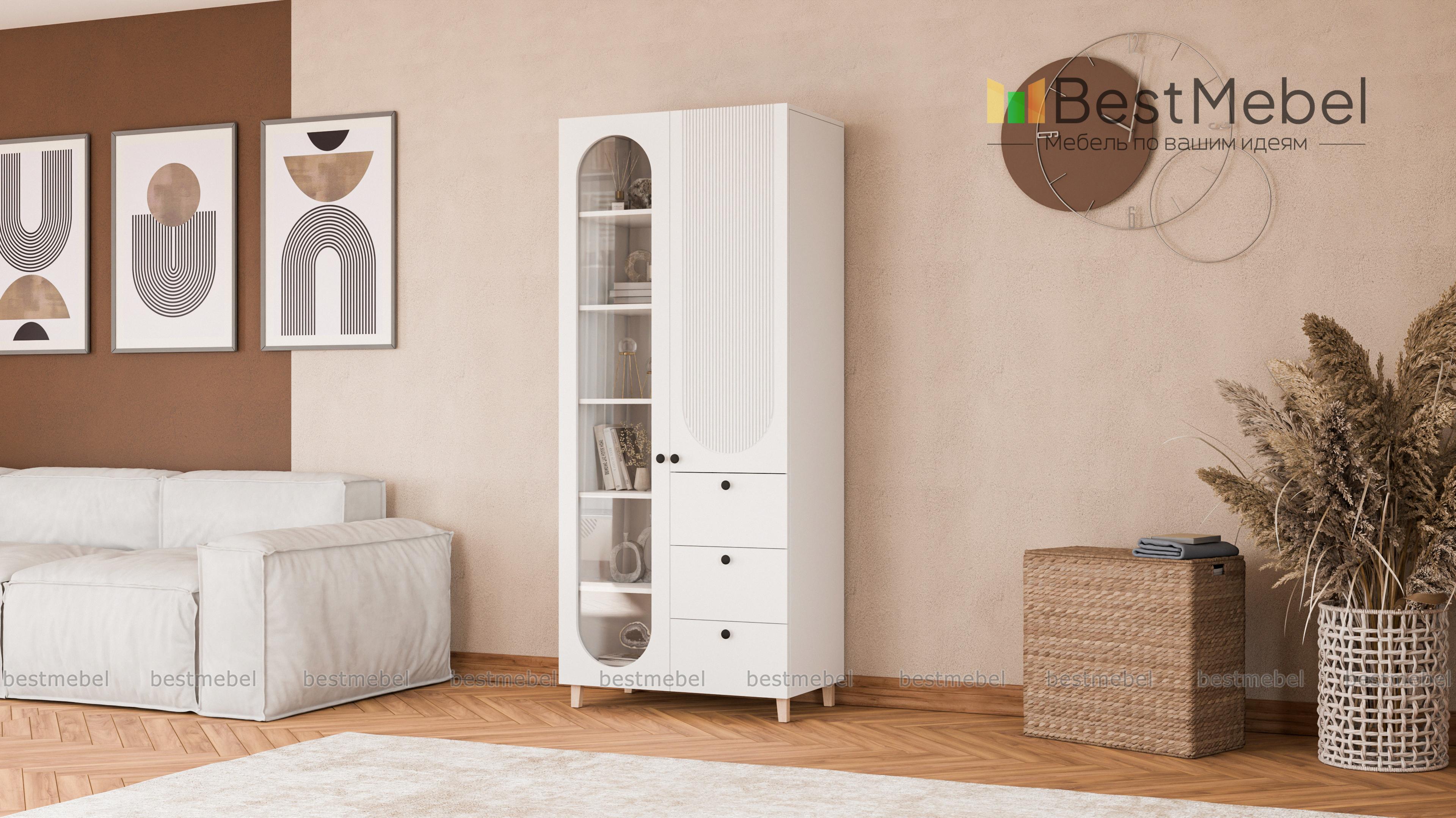Шкаф распашной Рене 7 BMS поможет грамотно спланировать хранение в детской или гостиной. На полках за стеклом с овальным вырезом будут красиво представлены книги, предметы коллекции и декоративные мелочи, а для прочих вещей предусмотрены закрытая секция и ящики. Шкаф с высокими ножками выполнен в актуальной палитре, оригинальный рельеф на фасаде завершает стильный образ. Купить шкаф распашной Рене 7 BMS, изготовленный по индивидуальным размерам, приглашаем в наш интернет-магазин.