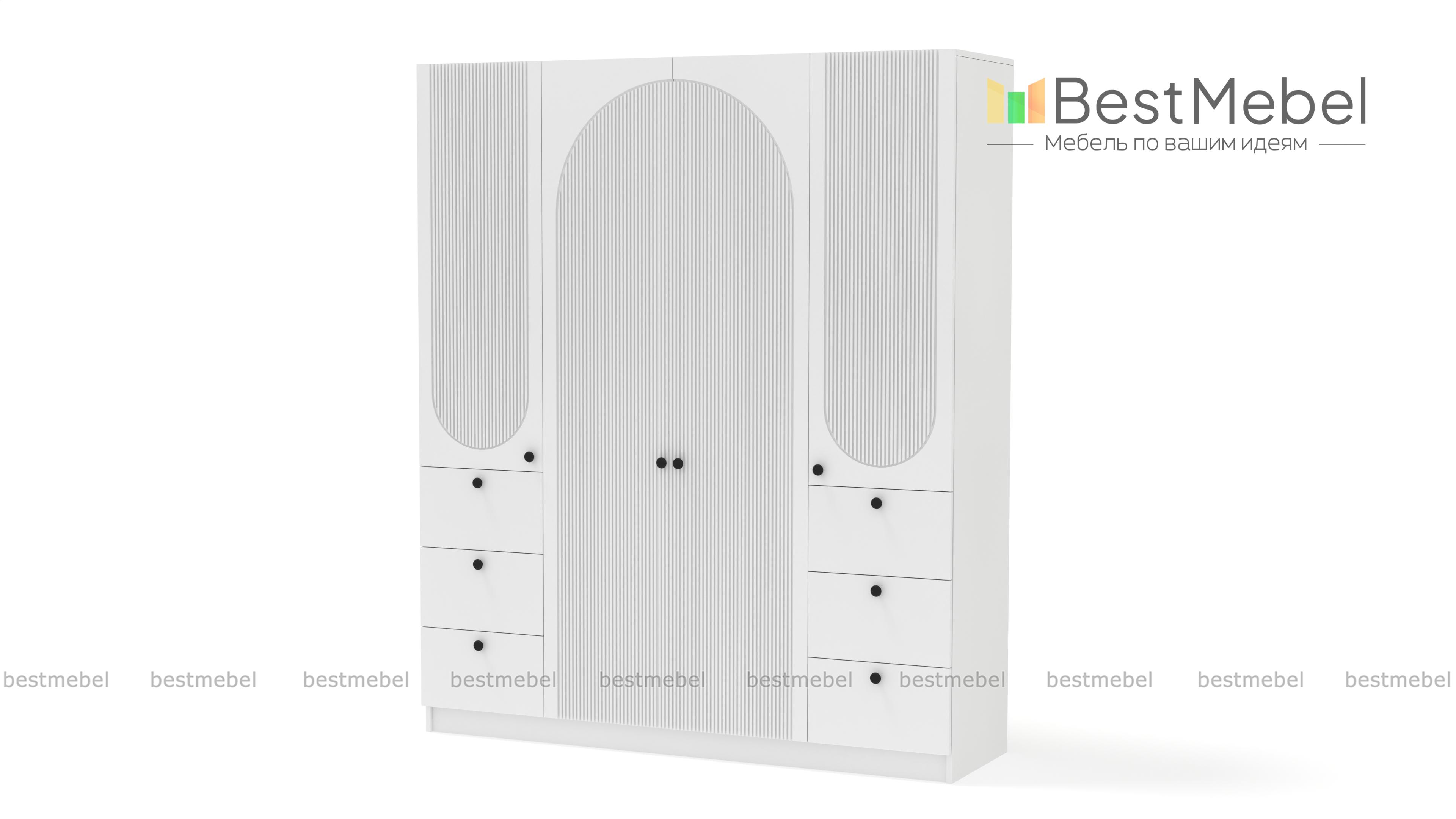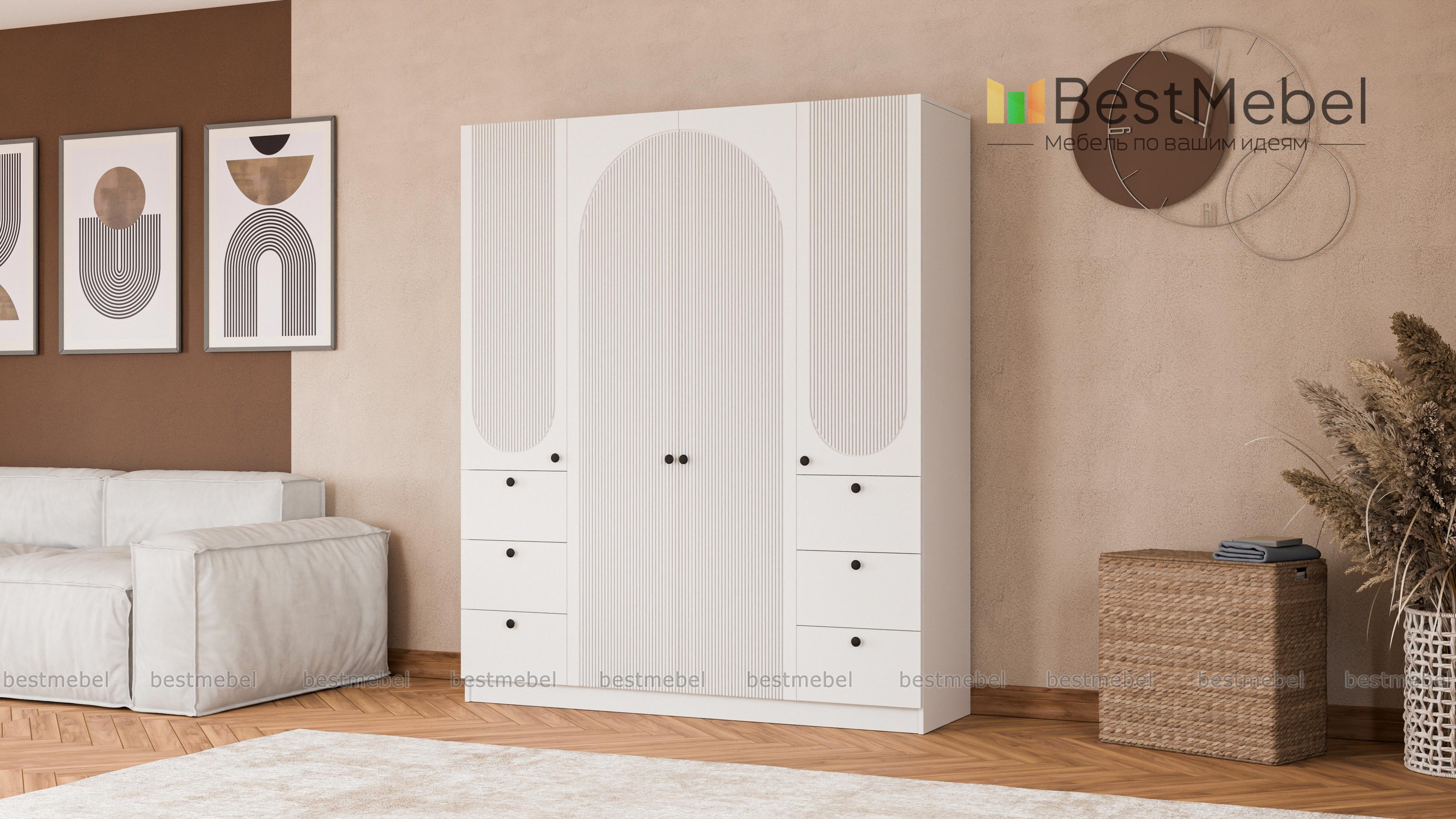 Шкаф распашной Вивьен 13 BMS гармонично смотрится в современном интерьере и обладает удобным функционалом. Отделение для вешалок за двумя дверцами в центре, а по бокам — закрытые бельевые полки и выдвижные ящики для мелкого трикотажа и аксессуаров. Модель с глухими дверцами не выглядит громоздко благодаря светлому оттенку фасада и изящному арочному рельефу. Купить шкаф распашной Вивьен 13 BMS вы сможете в нашем интернет-магазине, подобрав фурнитуру и цвет по своему вкусу.
