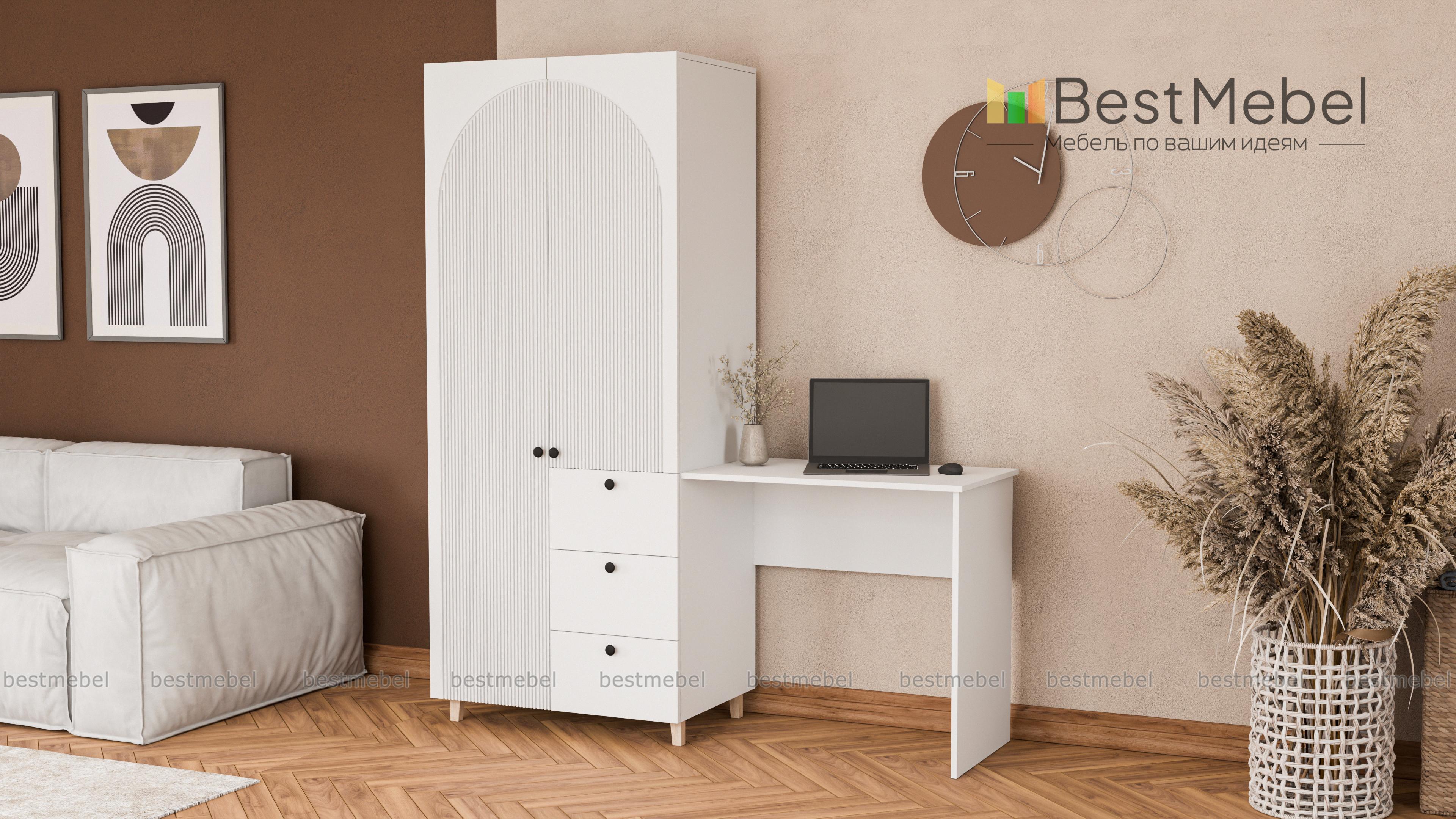 Шкаф со столом Вивьен 4 BMS значительно экономит пространство небольшой комнаты. Компактный гардероб с распашными дверцами и рядом из трех выдвижных ящиков объединен со столиком, удобным для учебы, работы и творчества. Стильный дизайн с высокими опорами, фрезерованной отделкой фасада и трендовыми оттенками украсит интерьер современной квартиры. Купить шкаф со столом Вивьен 4 BMS вы сможете в нашем интернет-магазине с изготовлением по индивидуальным размерам.