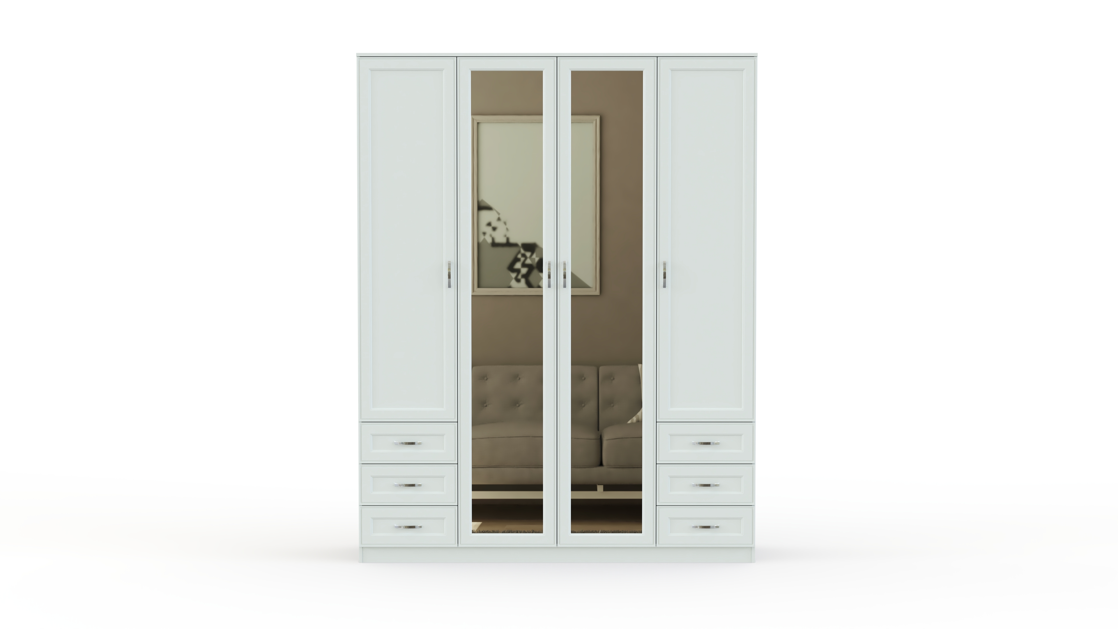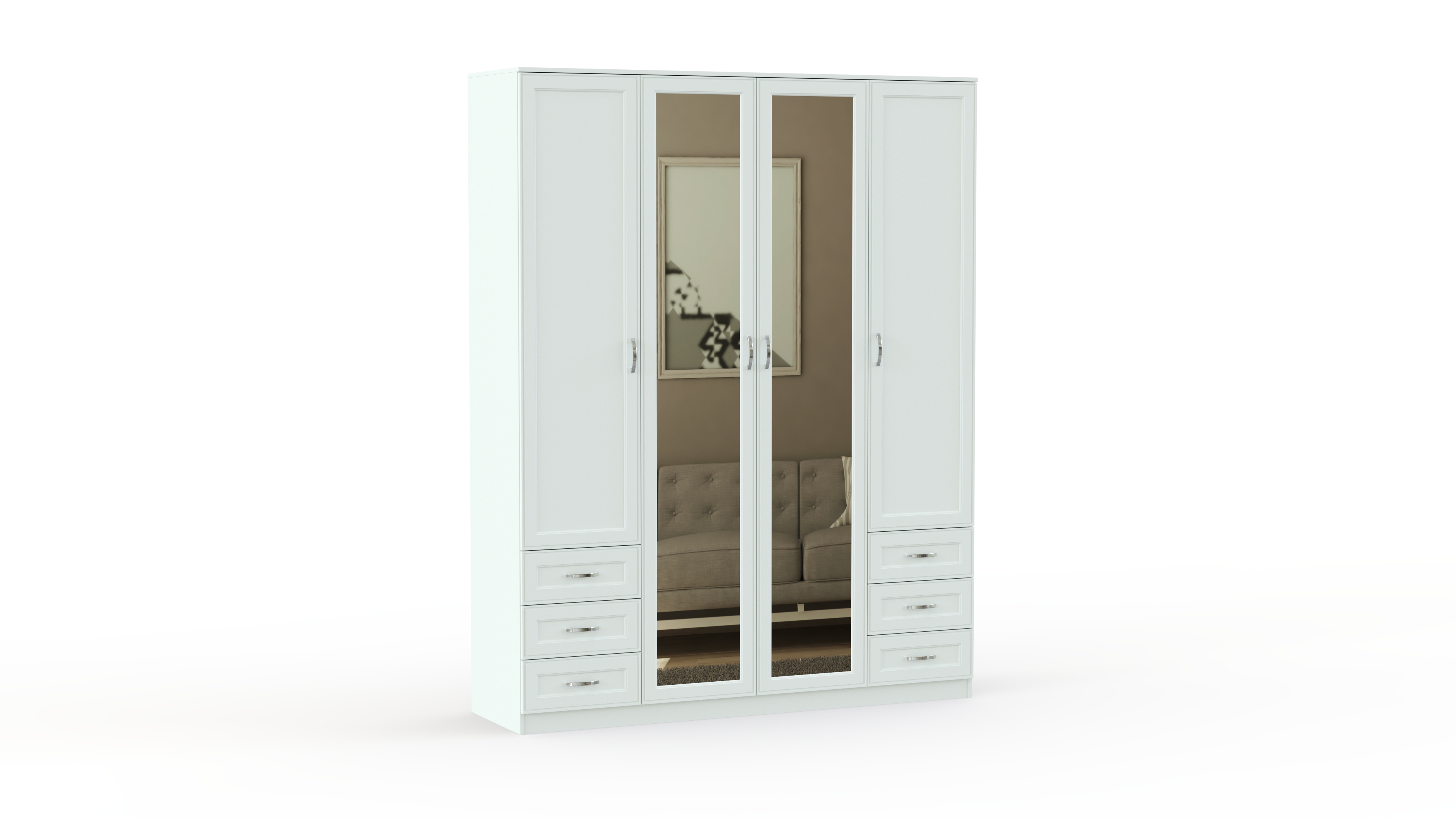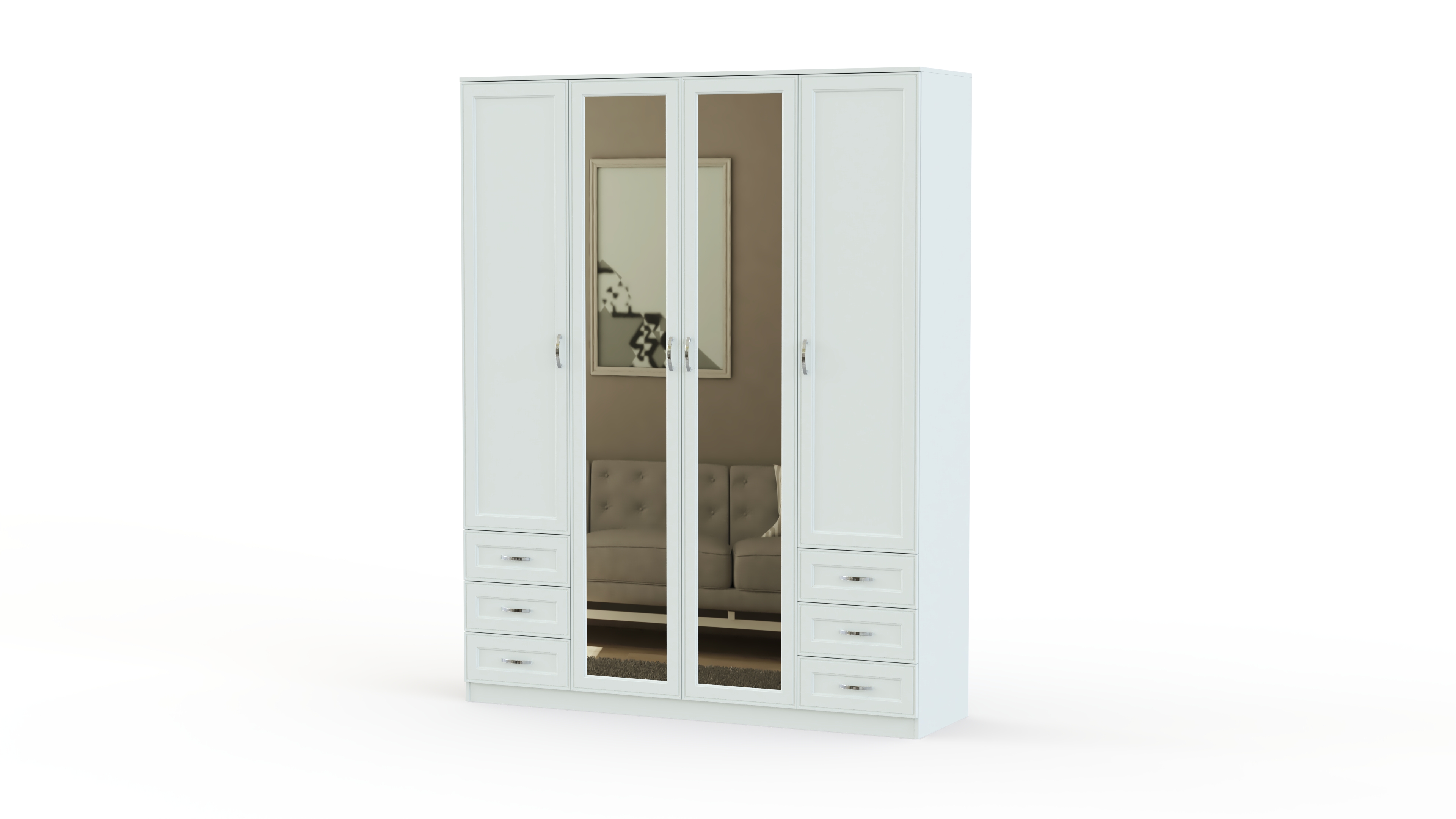 Элегантный в своей простоте, классический комплект для спальни в традиционном стиле. Гарнитур Габриэлла BMS состоит из двуспальной кровати с тумбами, вместительного комбинированного шкафа с зеркалами и комода с навесным зеркалом. Спальня выполнена из качественных материалов в светлых тонах и декорирована по фасаду планками. Спинка кровати отделана мягким контрастным кожзамом, простеганным ромбами, дополняет стильный образ неброская изящная фурнитура.