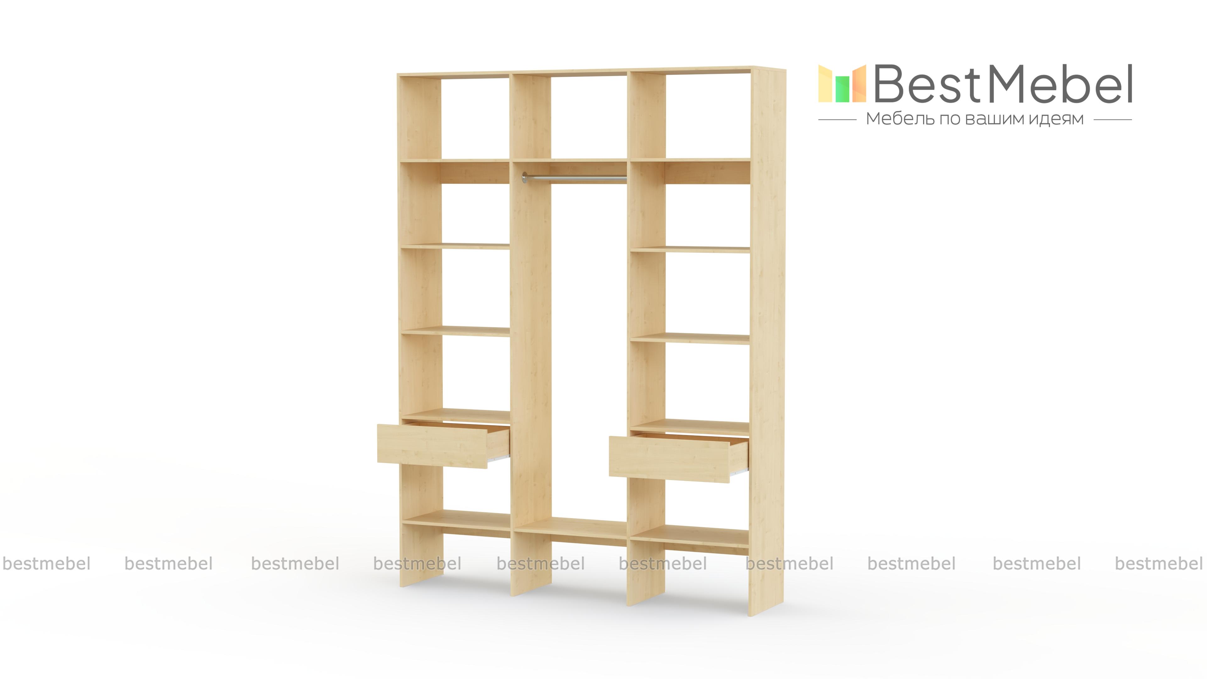 Стеллаж для одежды Мирта 14 BMS разработан специально для хранения в открытом доступе одежды, обуви и прочих предметов гардероба. В центре располагается отделение со штангой, а по периметру – открытые секции и два выдвижных ящика для мелких вещей. Визуально легкий и прочный, стеллаж выполнен из ЛДСП – износостойкого материала с широким выбором цветовых решений. Купить стеллаж для одежды Мирта 14 BMS, изготовленный по вашим размерам, вы всегда сможете на сайте нашего интернет-магазина.