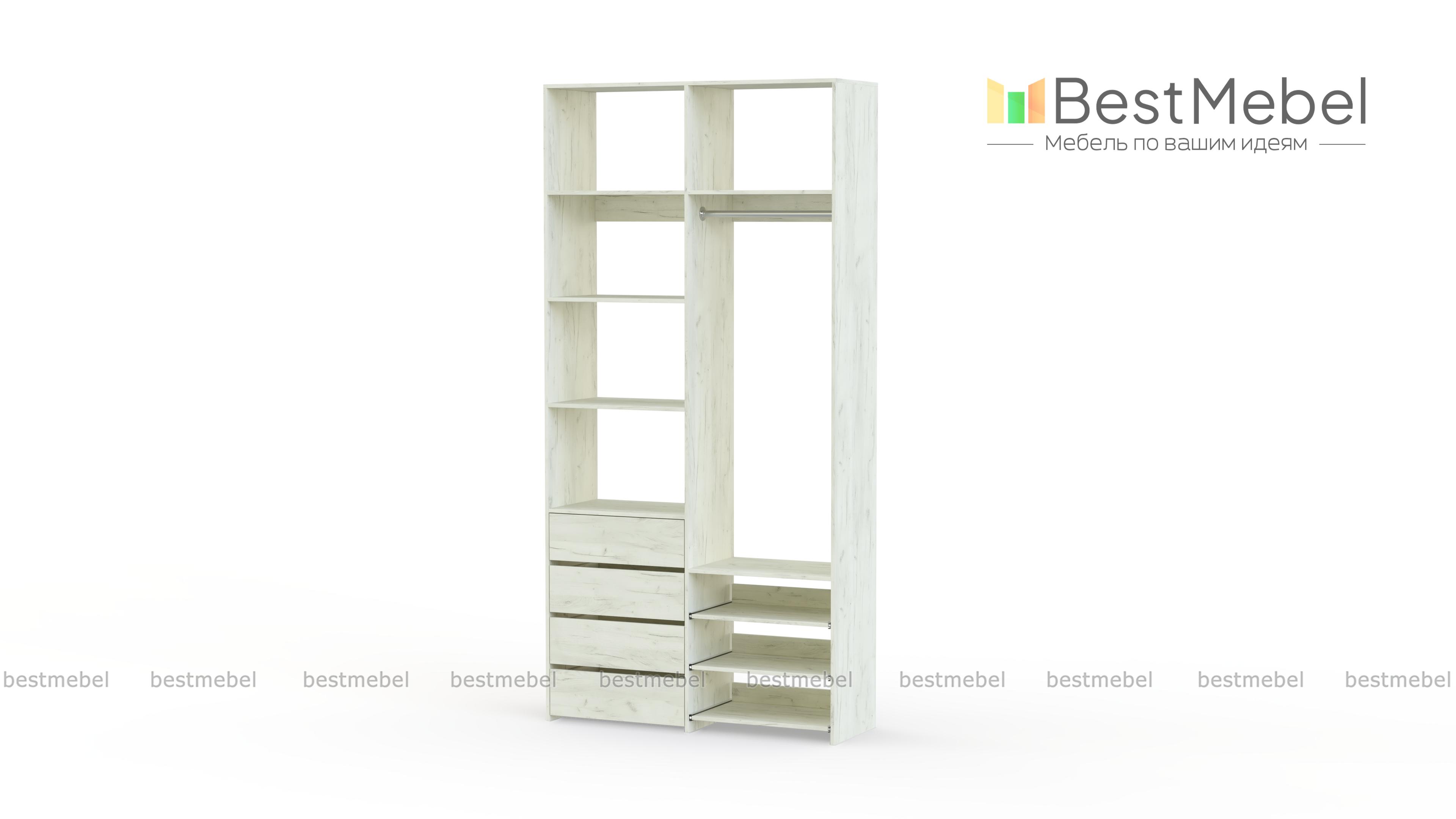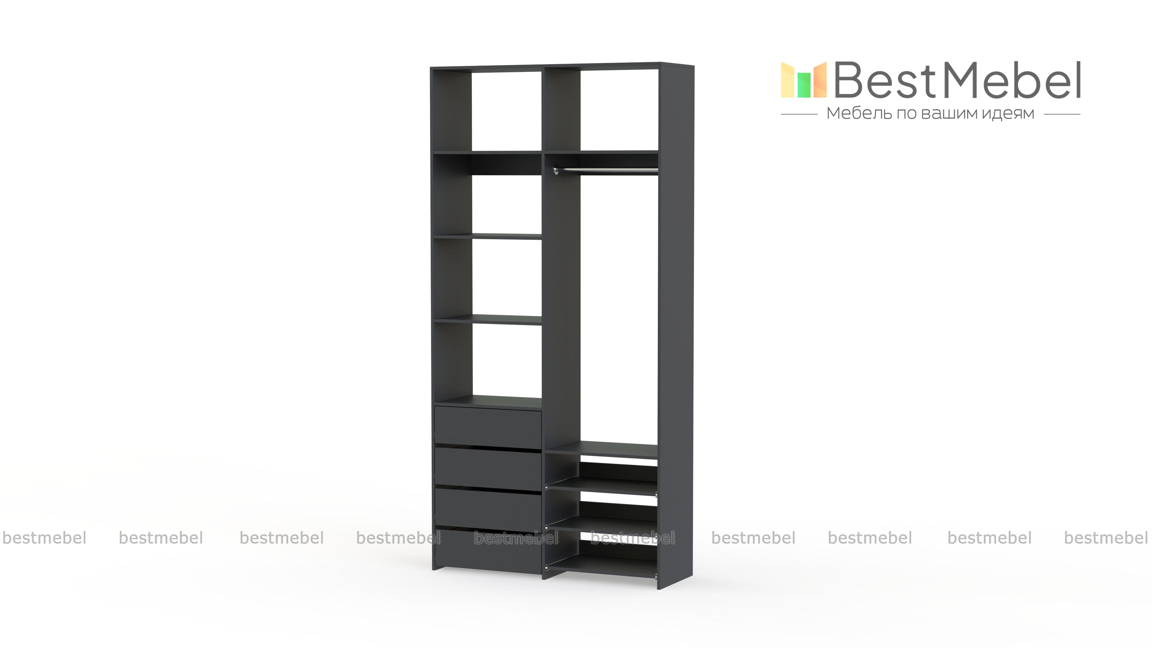 Стеллаж для одежды Мирта 87 BMS оптимален для небольших пространств. Штанга, выдвижные полки и ящики, а также пять просторных бельевых секций обеспечивают достаточно места для хранения базового гардероба. Простой и функциональный дизайн в сочетании с широкой цветовой гаммой позволяют легко комбинировать стеллаж с другой мебелью. Купить стеллаж для одежды Мирта 87 BMS с изготовлением по индивидуальным размерам вы сможете недорого в нашем интернет-магазине.