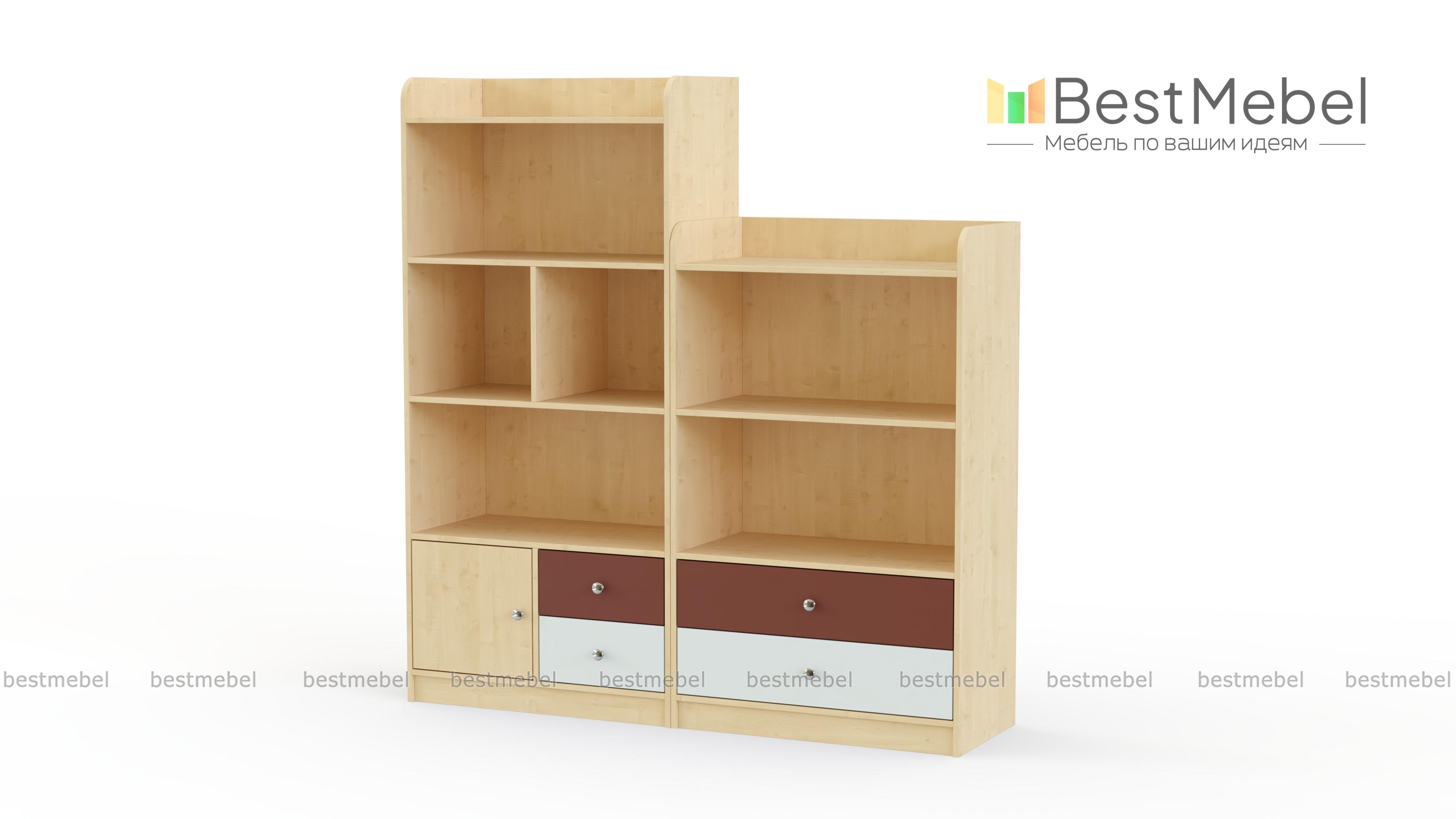 Стеллаж Радуга 4 BMS включает в себя два модуля – низкий, оборудованный открытыми полками и выдвижными ящиками, и высокий, дополненный распашным отделением. Практичная композиция позволит разместить любимые книги ребенка, игрушки, принадлежности для творчества и многое другое. Гармонично впишется в интерьер современной детской сочетание нейтрального белого с цветными матовыми вставками. Купить стеллаж Радуга 4 BMS приглашаем в наш интернет-магазин по доступной цене.