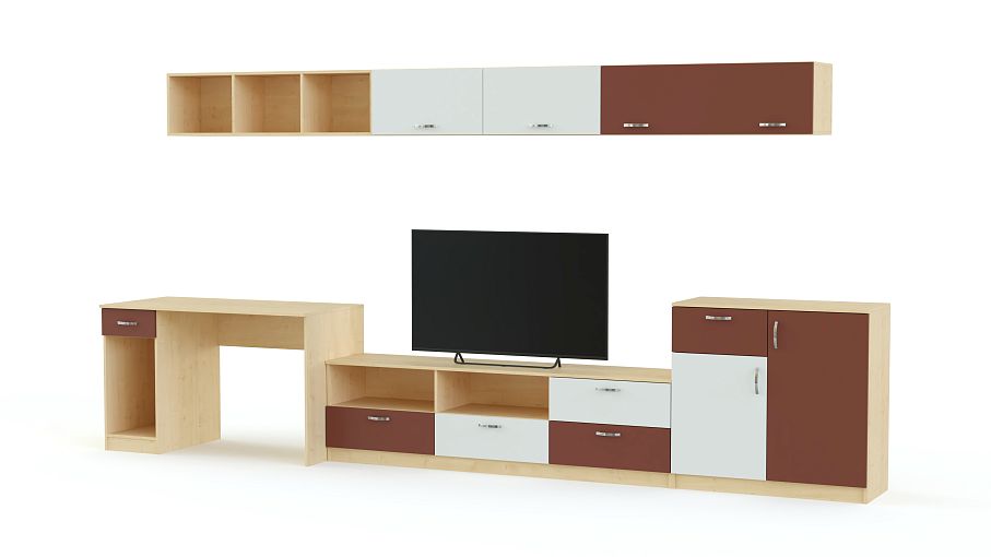 Стенка с рабочей зоной Мирикл BMS – это яркая минималистичная композиция для меблировки небольших современных гостиных, студий и молодежных комнат. Вы сможете объединить рабочее место с зоной размещения ТВ и значительно сэкономить пространство. Модульный комплект в контрастных тонах включает в себя компьютерный стол, низкую тумбу под аппаратуру, высокую тумбу и навесные полки с открытыми и глухими фасадами. Купить стенку с рабочей зоной Мирикл BMS приглашаем на сайт нашего интернет-магазина.