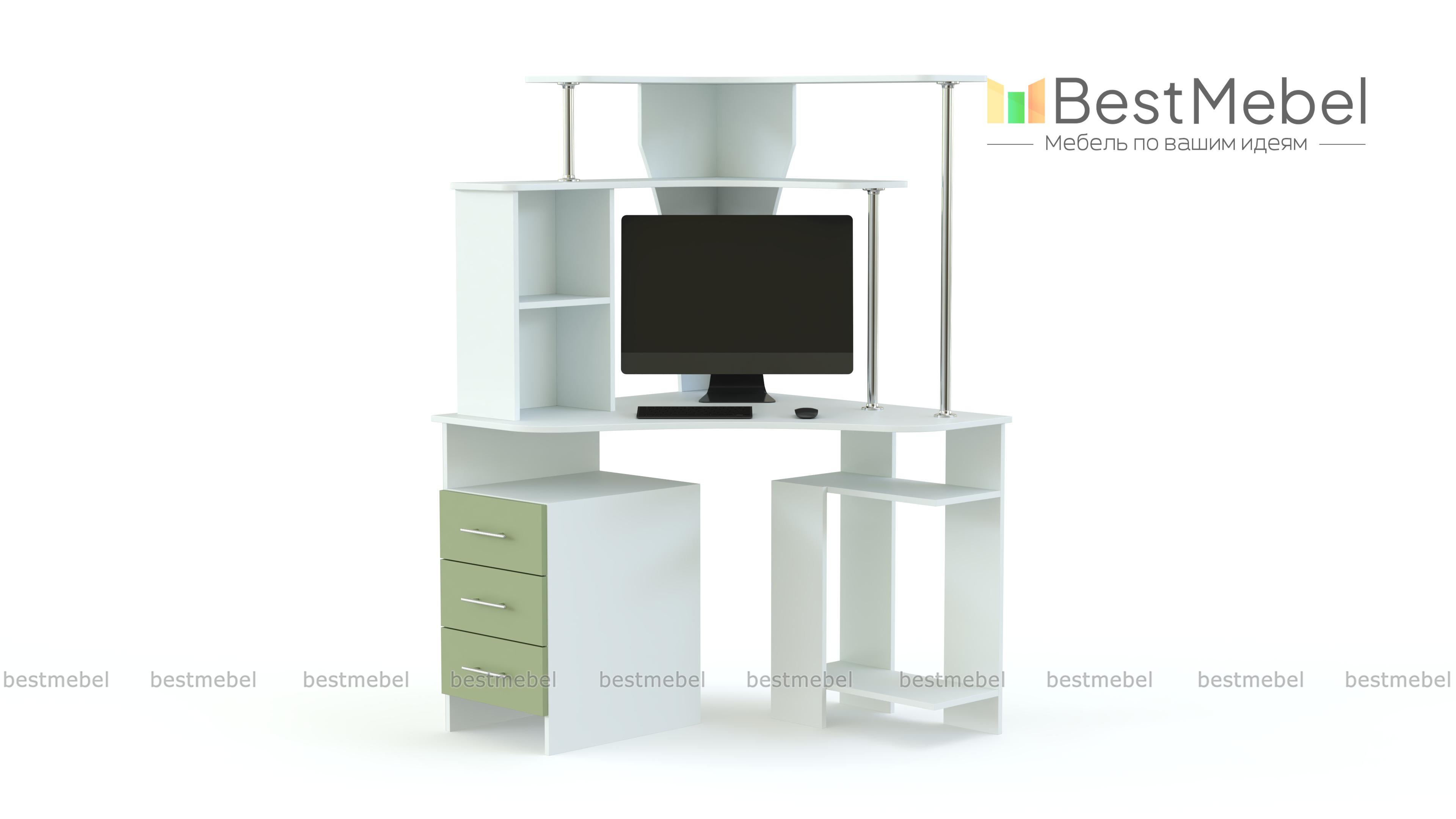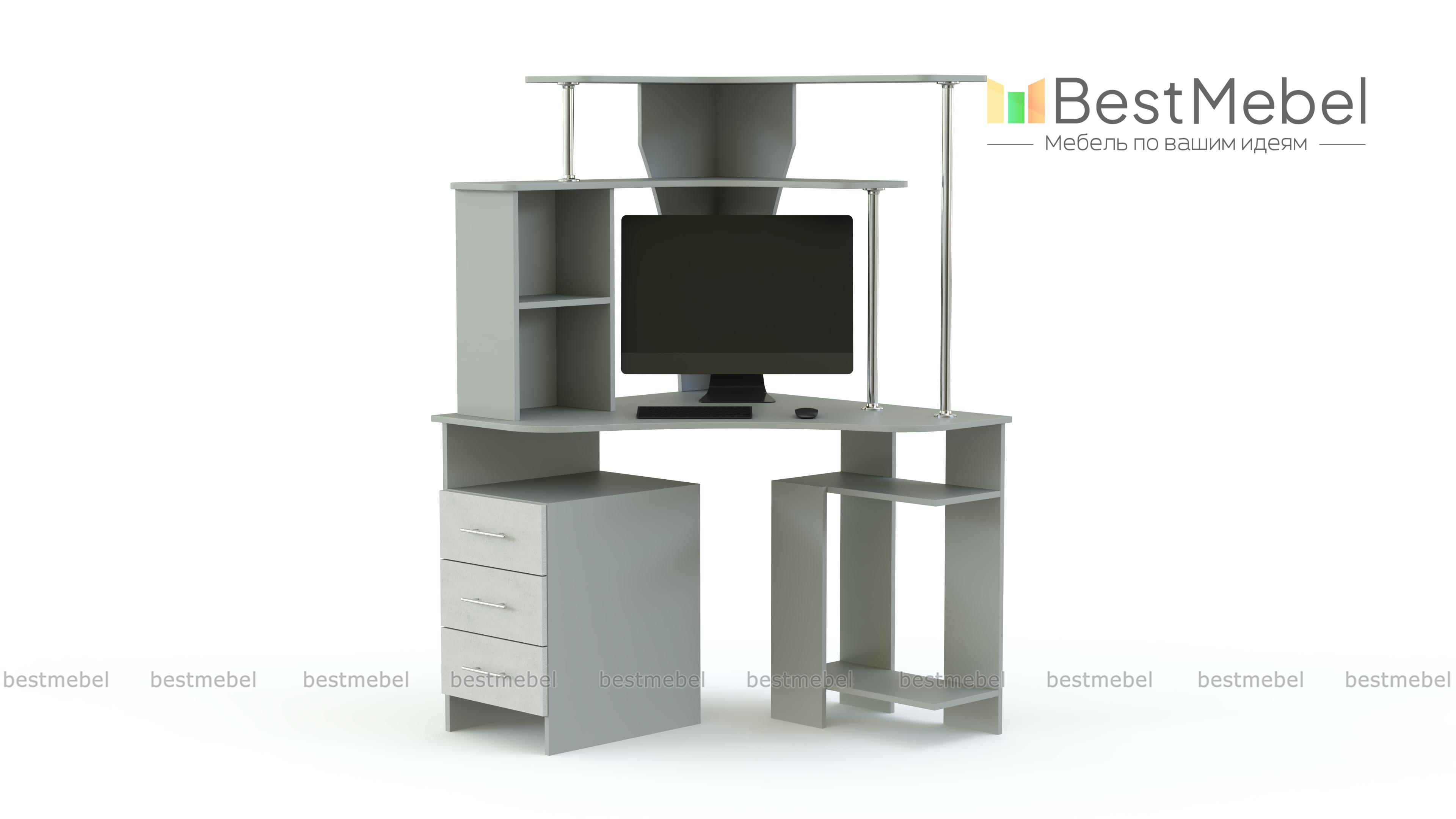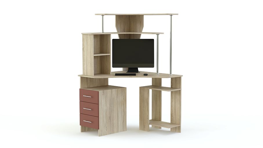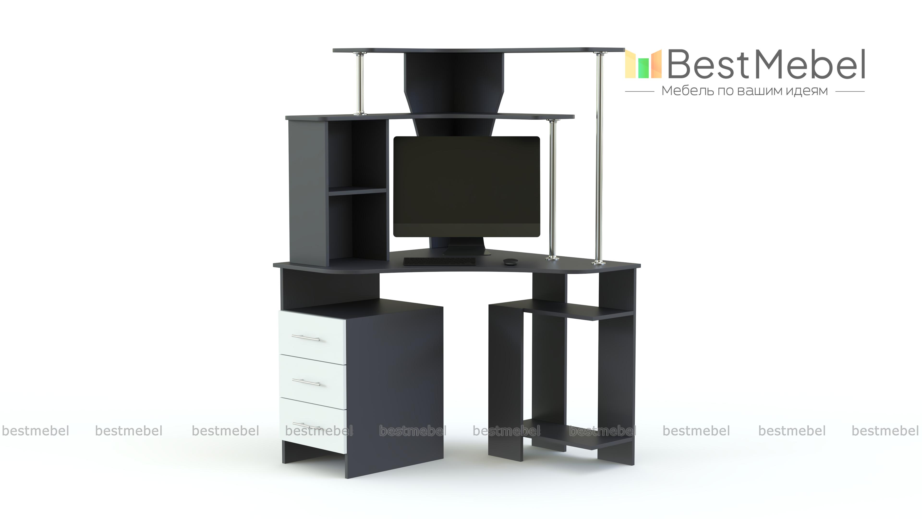 Практичная угловая модель МБ-4.1 BMS позволит организовать максимально комфортное рабочее место, выгодно используя свободное пространство в помещении. Стол оборудован просторной столешницей эргономичной формы, боковой тумбой с выдвижными ящиками для мелочей и отделением под системный блок. Верхняя надстройка – несколько открытых полок на легких металлических опорах. Яркий акцент в нейтральной расцветке – эффектные матовые фасады ящиков.