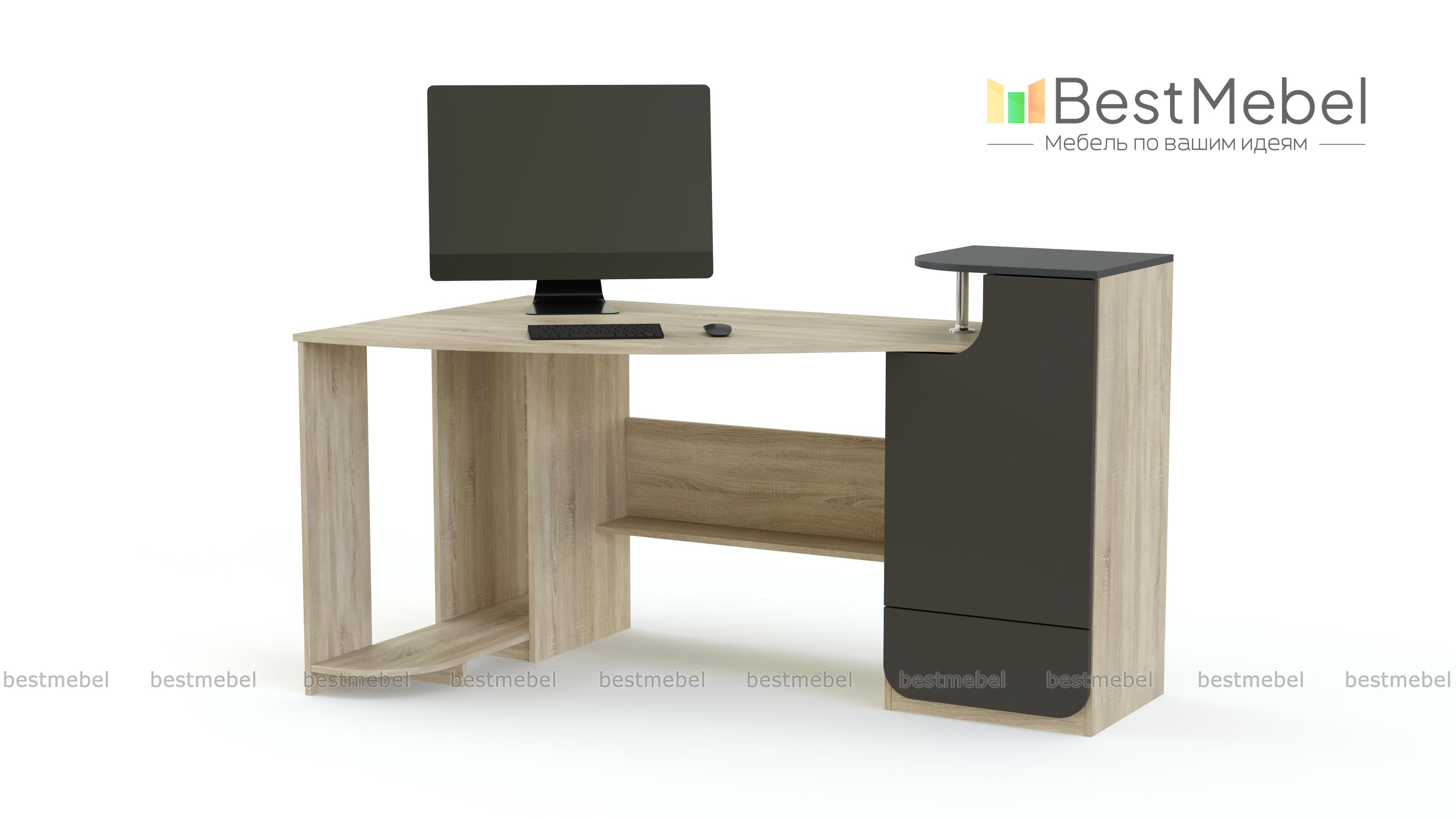 Стол компьютерный МБ-42.1 BMS поможет оборудовать комфортное и стильное рабочее место. Практичная угловая модель с боковым отделением выгодно использует доступное пространство и будет подходящим вариантом для малогабаритного помещения. Под столешницей с закругленным краем располагается полка для бумаг и отделение для системного блока. Вместительная боковая тумба оборудована распашным отделением с полками, выдвижным ящиком для канцелярских мелочей и удобной надстройкой на хромированной опоре. Купить стол компьютерный МБ-42.1 BMS вы сможете в нашем интернет-магазине по лучшей цене.