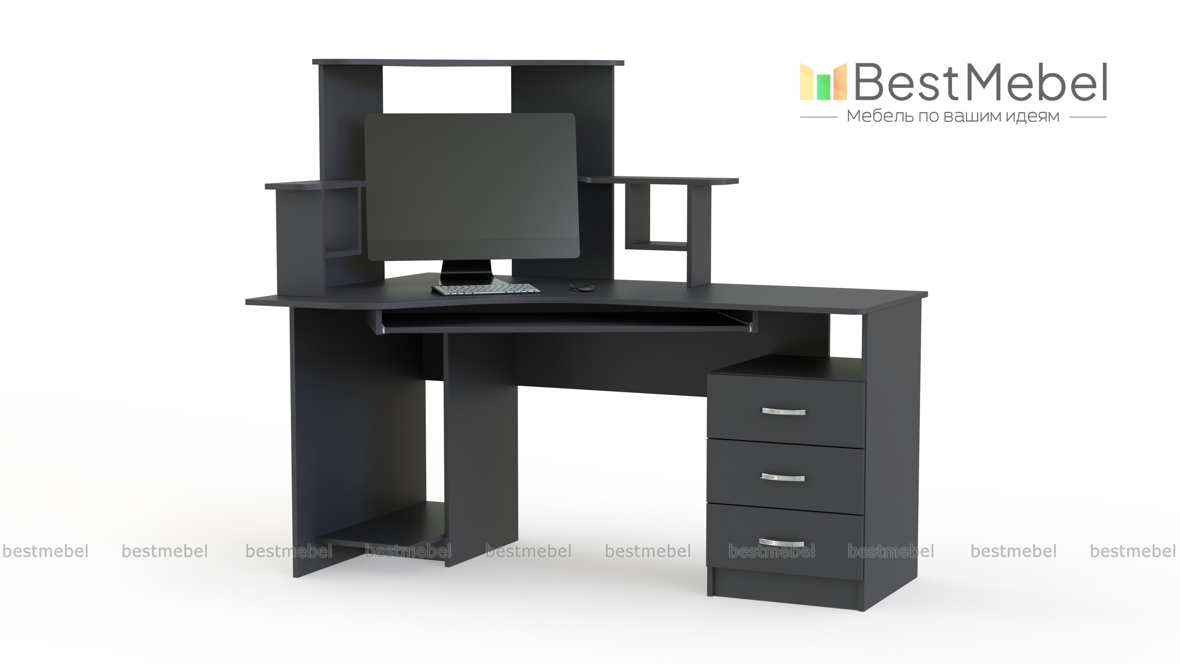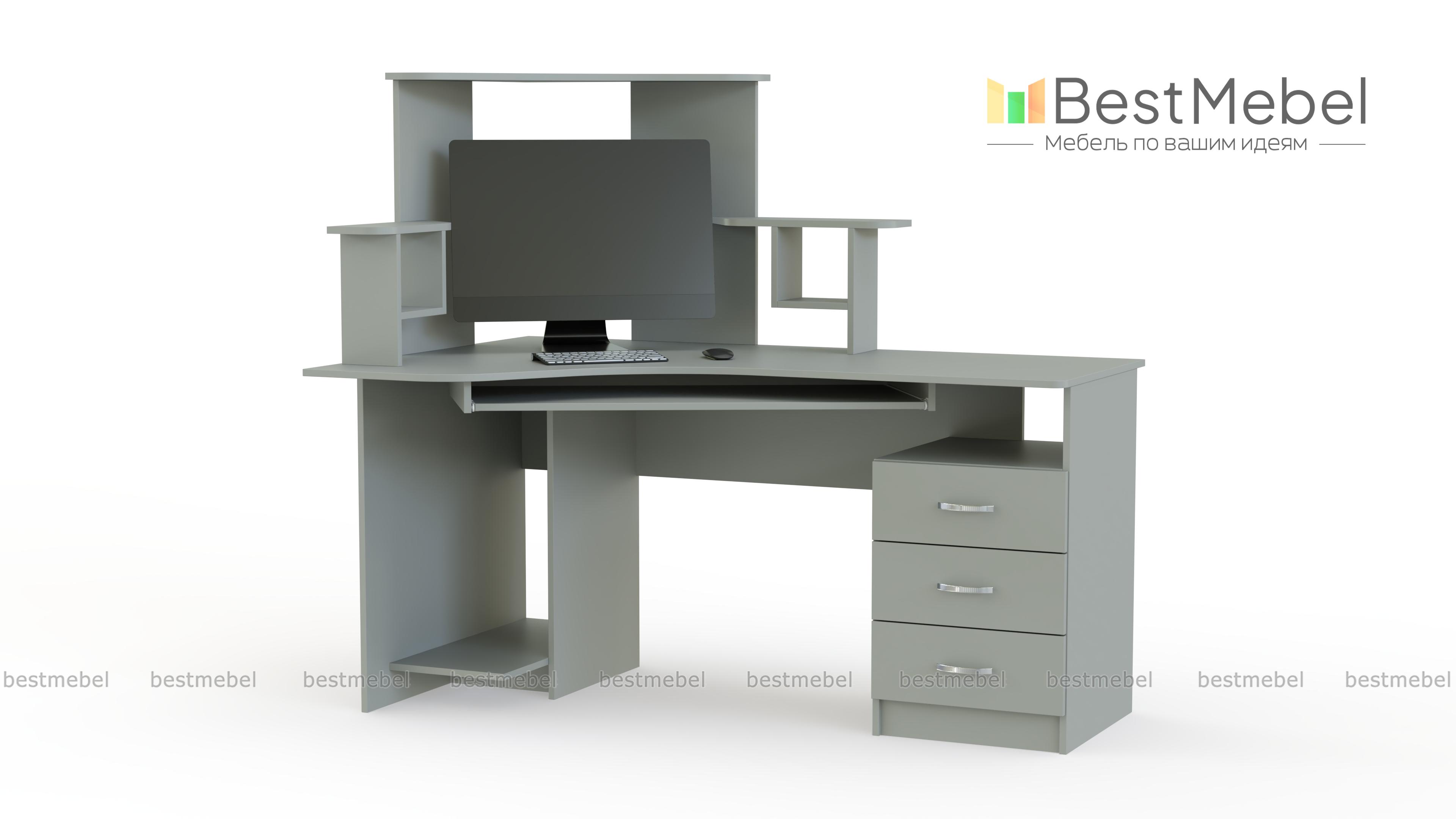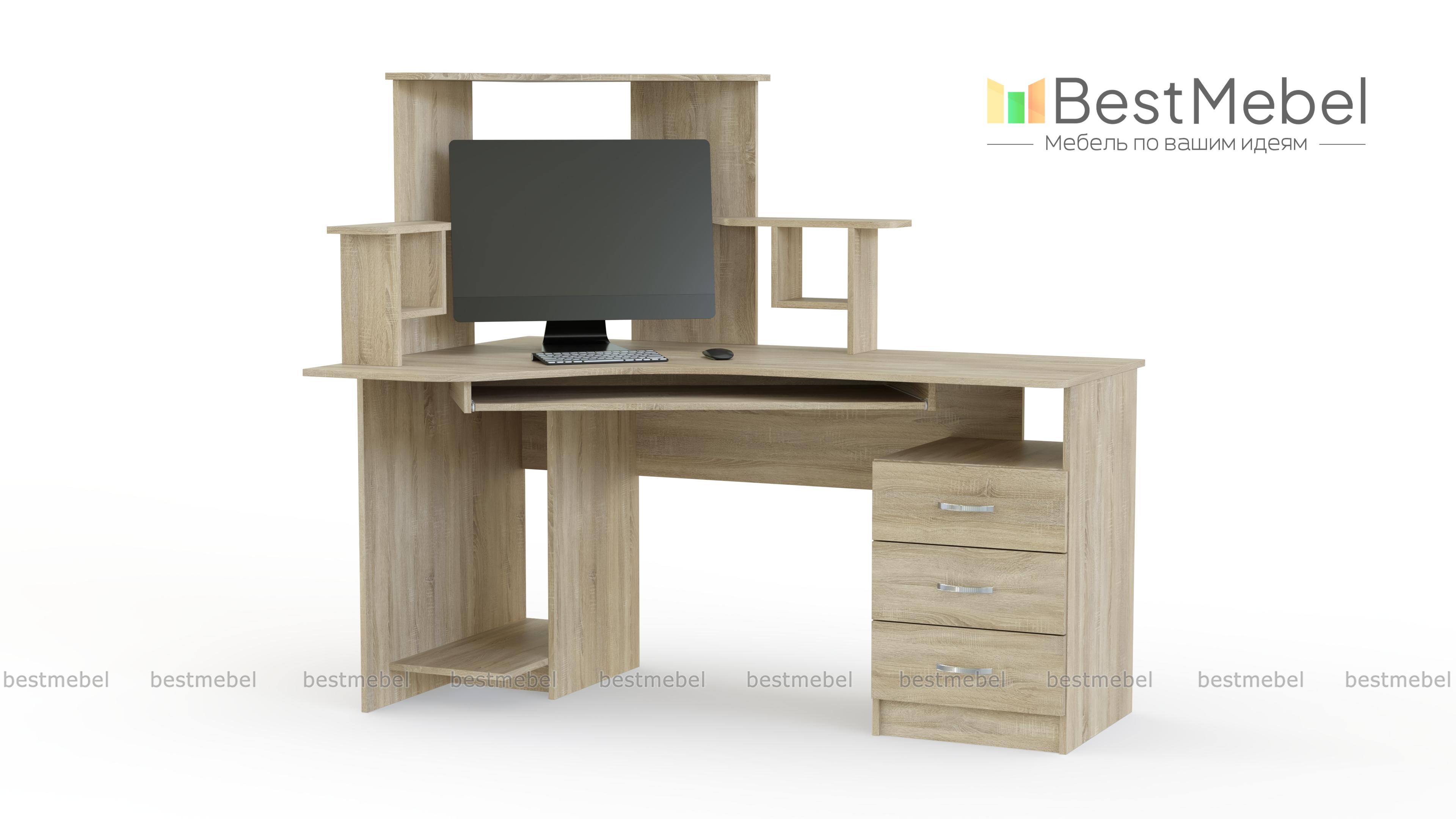 Угловой стол компьютерный СКУ-4 позволит сэкономить пространство в Вашей комнате и поставить всю необходимую Вам технику. В центральной части стола расположена глубокая ниша для монитора, а по бокам есть 2 стойки для мелочей. Наличие выдвижных ящиков сбоку позволяет хранить необходимые Вам документы и мелкие предметы. В нижней части удобно расположена полка под системный блок. Если Вас заинтересовала данная модель, Вы можете недорого заказать ее в нашем интернет-магазине.