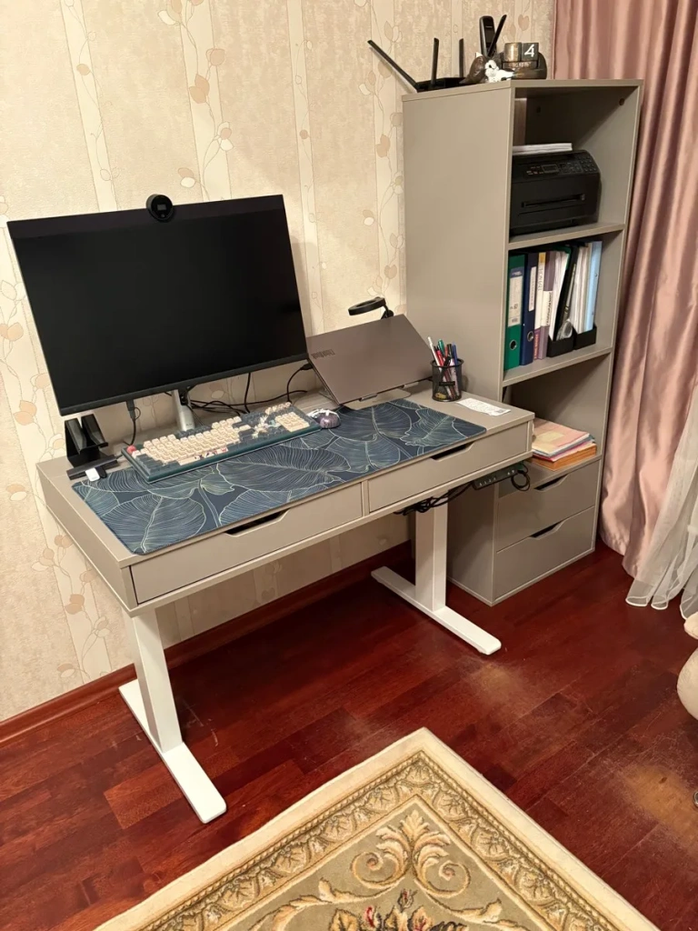Отличный стол, копия икеевского стола Алекс. Только есть возможность изменить размеры, отделку, цвет, направляющие. Заказала одновременно со стандартным стеллажом. Собрали сами без проблем. Прикрутили к подстолью с подъемным механизмом. Получился очень комфортный мини-офис на дому.
