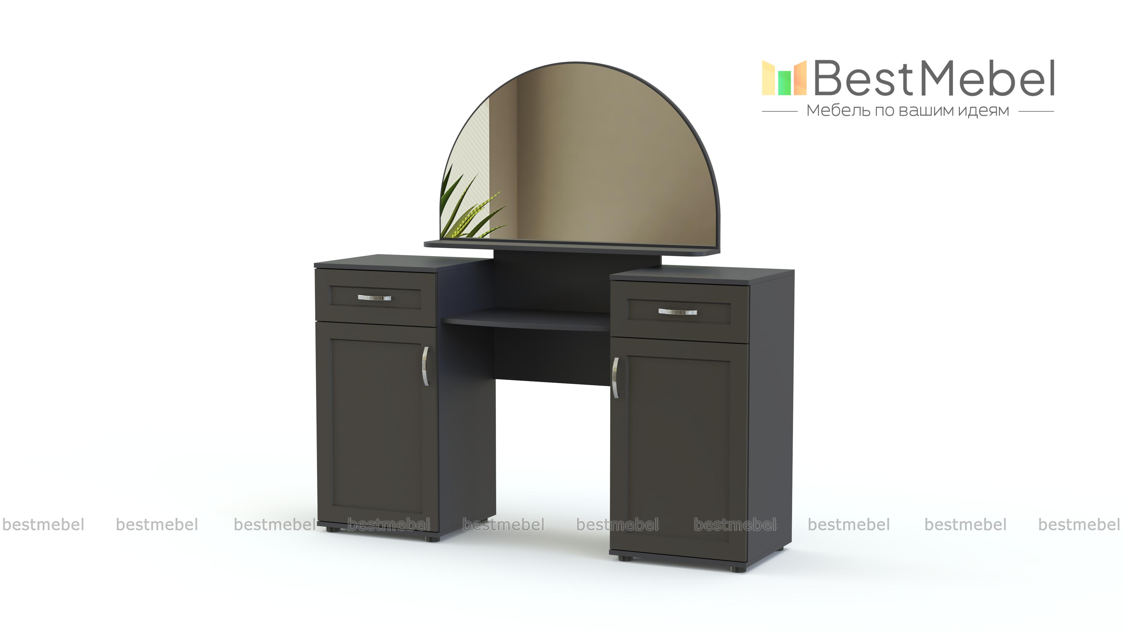 В этой модели элегантность стиля модерн сочетается с функциональностью современной вещи. Полукруглое зеркало, на полке которого будут оригинально смотреться парфюмерные флаконы, гармонирует со скругленной полочкой – столешницей. По бокам расположены вместительные тумбы с распашными дверцами и выдвижными ящиками для косметики и украшений. Фасады просто декорированы, фурнитура неброская и стильная. Приобрести туалетный столик Ника-Люкс BMS в подходящем цвете вы сможете у нас в интернет – магазине.