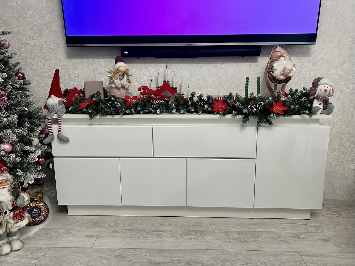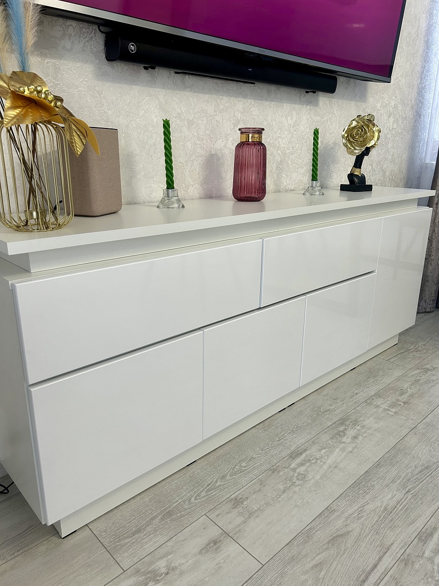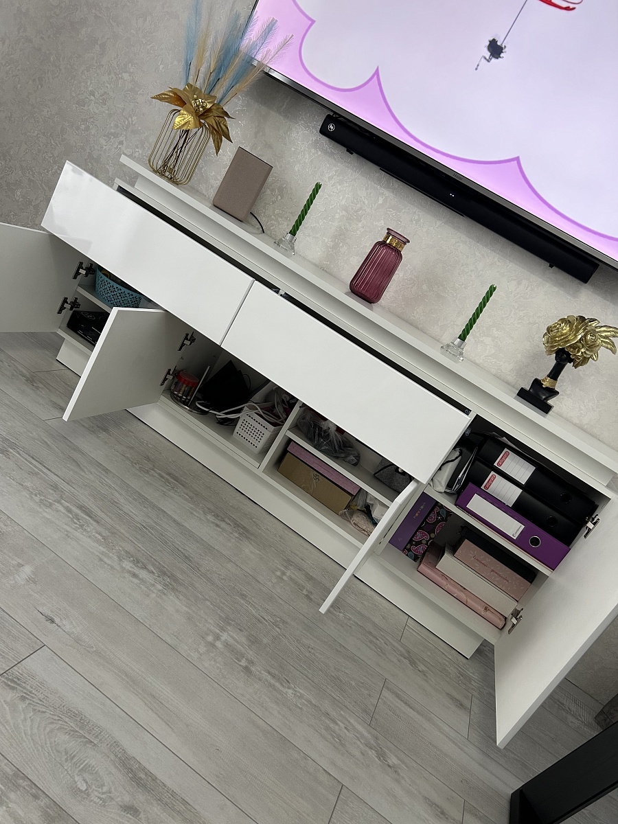 Заказ 1104688, тумба под телевизор.Спасибо, отличная тумба, хорошо вписалась в гостиную. Заказывала под свои размеры - спасибо интернет-магазину, очень удобная навигация.Единственное пожелание - доработать выпилы вместо ручек - слишком мелкие, приходится подхватывать ящик или дверцу ногтями, поэтому снимаю одну звезду.В остальном всё отлично - детали подогнаны хорошо, нигде никаких перекосов или выступов.
