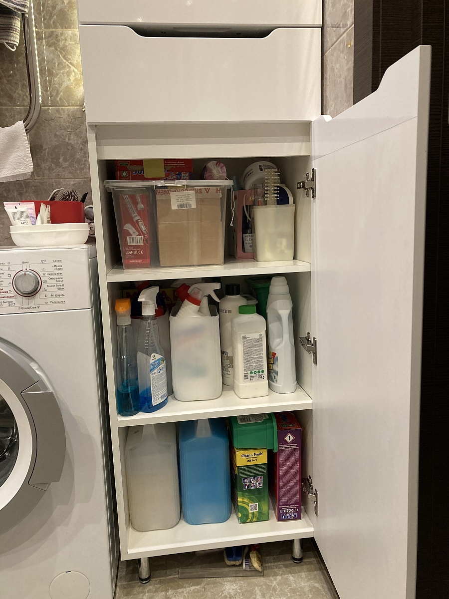 Тумба хорошая, свои функции выполняет. Пришлось доработать дверцы, чтобы надежнее закрывались (приспособили магниты к ним). Вместительная!