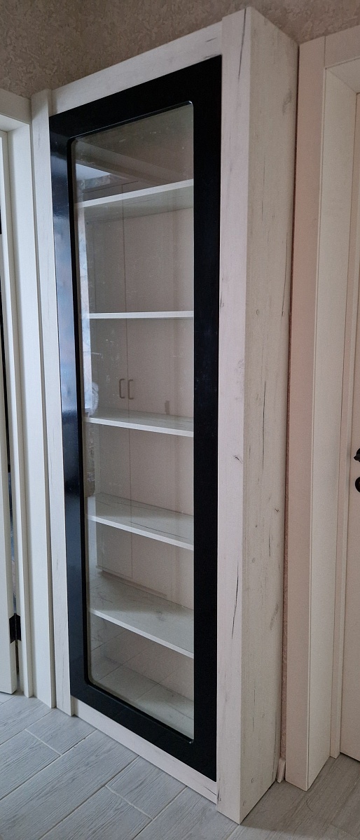 Стеллаж хоть и называется торговый, но обратила на него внимание для использования дома в качестве книжного шкафа. Его несомненный плюс это толщина, у меня таких шкафа два, один 20 см а второй 23 см сделанные по своим размерам. Они оба встали в незаметные ниши которыми все равно не пользуюсь, толщины 20 хватает ровно на одну обычную книгу. Вся библиотека как на ладони. Второй плюс это дверца, лично я не люблю когда книги хранятся на полках и собирают пыль. Так что закрытый шкаф со стеклом вариант идеальный. Цвет дуб крафт белый, фасад глянец черный. Смотрится красиво. Так же под заказ была добавлена дополнительная полка внутрь, конструктор в магазине самостоятельно раскидал поровну высоту полок, так же удобно, нет сверху больших бесполезных пространств. Возможно если добавить еще одну полку тоже будет хорошо, надо считать. На фото шкаф 23 см.