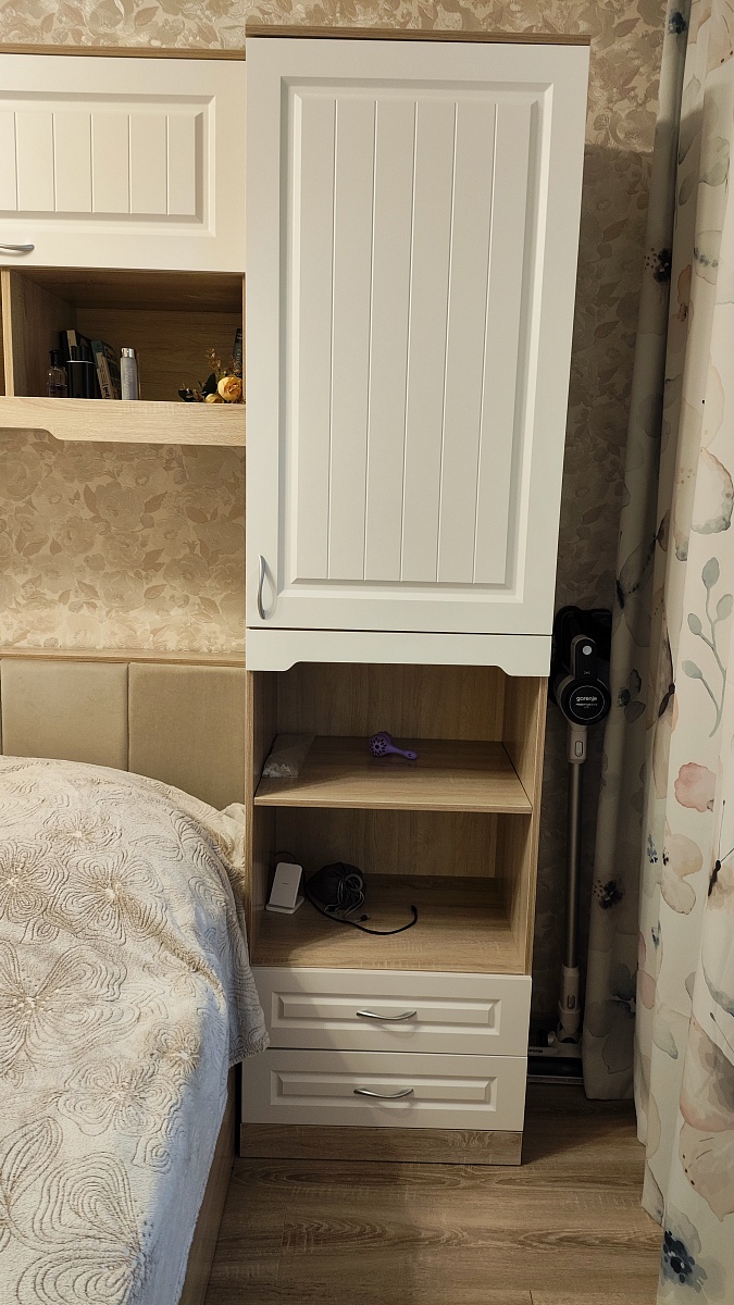 Заказали кровать от спальни Линда (там мягкие вставки), а остальное-серия Прованс.Так понравилось больше.Кровать - с подъемным механизмом, изголовье - взяли нестандартное. Повыше и полочка в изголовье тоже поглубже.В боковых стойках изменили ширину, глубину и высоту от стандартной. Также оставили открытыми только 2 полки.Всё с доводчиками.Что сказать? Собирал я сам. Очень хочется посмотреть в лицо человеку, кто инструкцию по сборке  сделал на четверти листка А4. Если вы привыкли собирать что то икеевское, то Вам потребуется много времени. Про качество: производитель забыл просверлить несколько дырочек. Сверлить пришлось. Справедливости ради - не просверлил только 3 штуки в одной стойке. В принципе - терпимо. По гарантии не обращался.Полик в кровати - из оргалита. под ним мало ребер жесткости. Сейчас он не нагружен особенно, но прогнулся. Если Вы поставите что то тяжелое - проломится.Цена за мебель адекватная, доставка бесплатная, а вот подъем - очень больно  ощутился. В моем случае - было много коробок, подъем на 7 этаж на лифте (лифты пассажирские). Но и стоимость доставки составила более 8 тысяч рублей! Имейте это в виду. Я был на работе в этот день, принять заказ могла только жена и теща. Т.е. вариант с поиском альтернативных вариантов подъема или "затащить самостоятельно" был нереален.Выдержка из правил на сайте: "Для крупногабаритных товаров с кол-вом упаковок 10 и более цена подъема удваивается "Итог: мебель нормальная. внешне - нравится. Цена адекватная.  Но подъем на этаж - неадекватный для заказов, где более 10 коробок.Заказ 00000963665, изделие ИН Спальня (1864х2200х500)